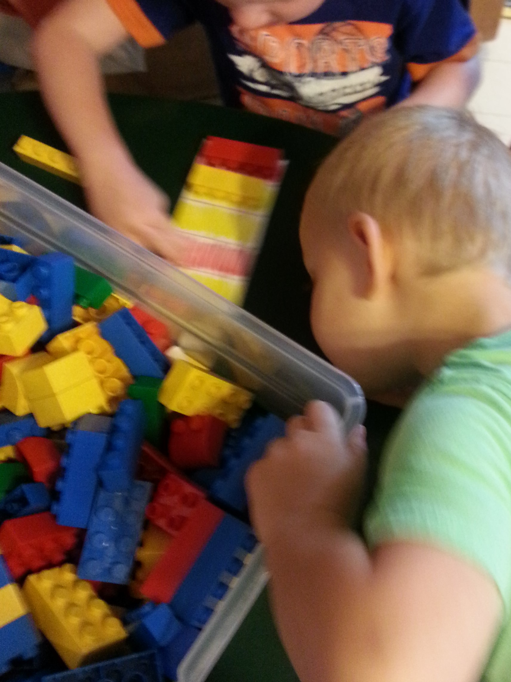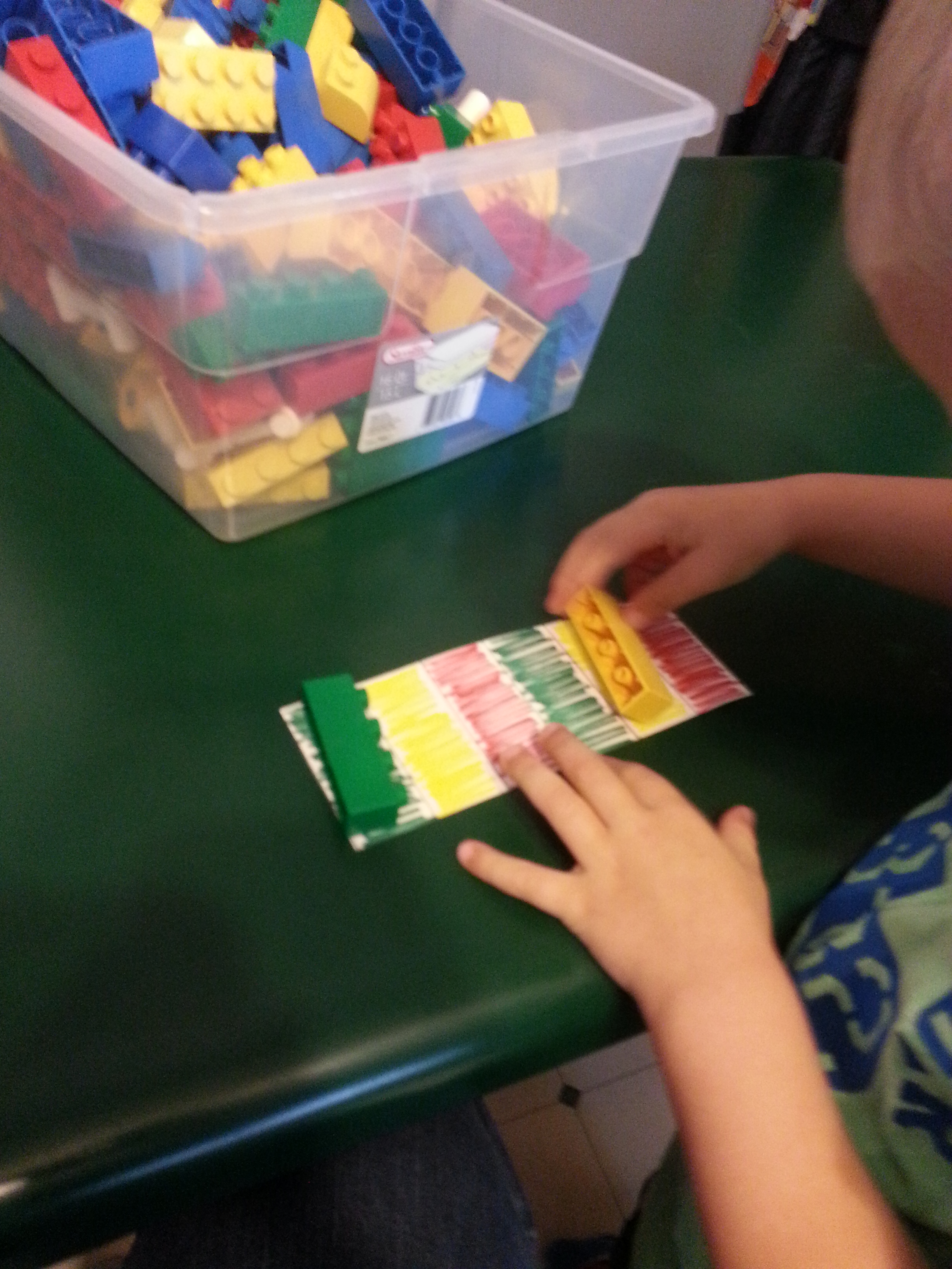 We used these expired posters from her place of employment with Legos to match, name colors and begin patterning skills.