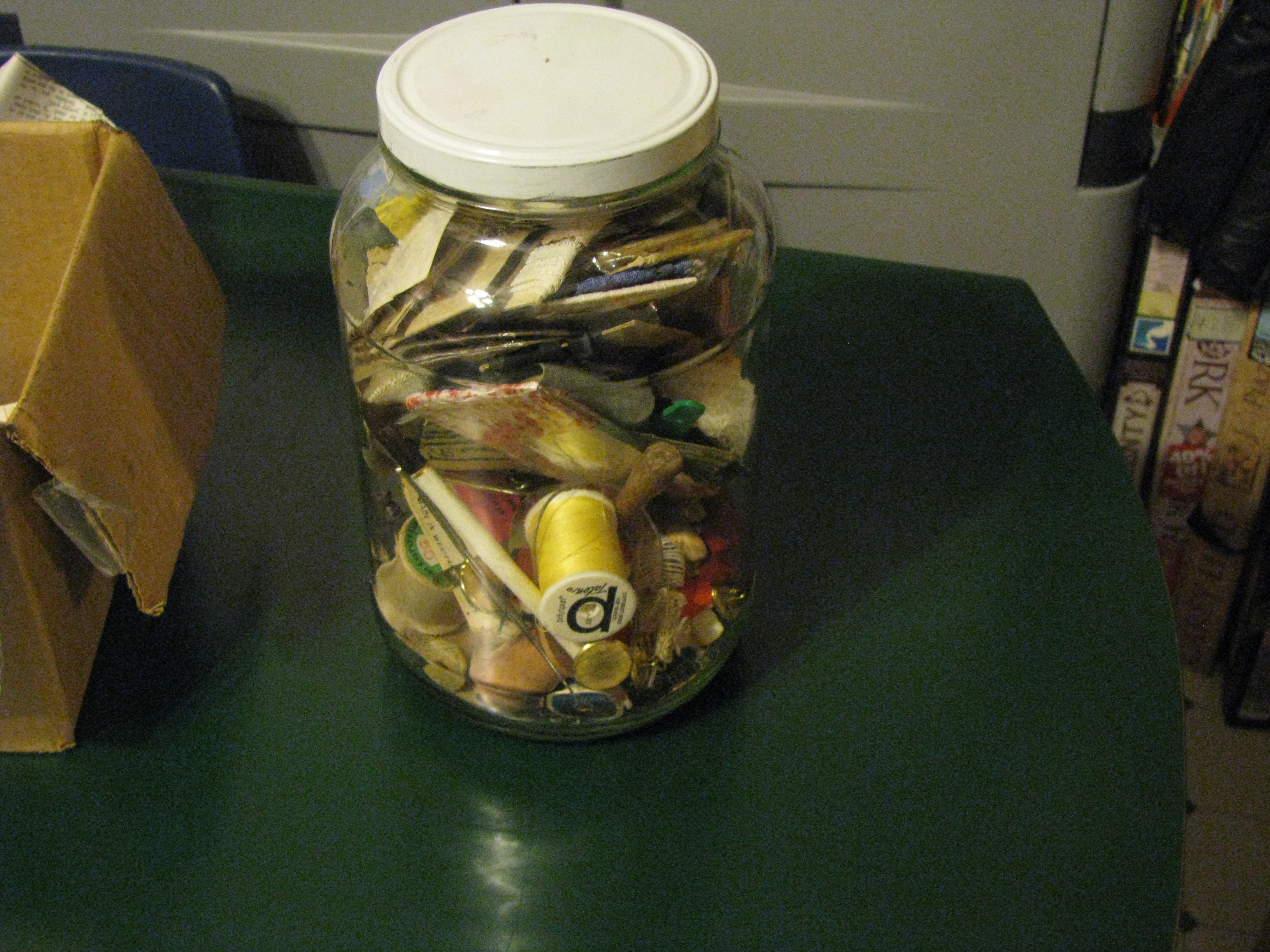 My Mother-in-law went ‘hunting’ last week. I got a phone call asking me if the described jar was a good buy. I let the hubby answer the question. Hunter’s quickly answer yes many times when good buttons and thread are concerned so I let him be the judge to stifle my grins that could not be seen in a phone call.