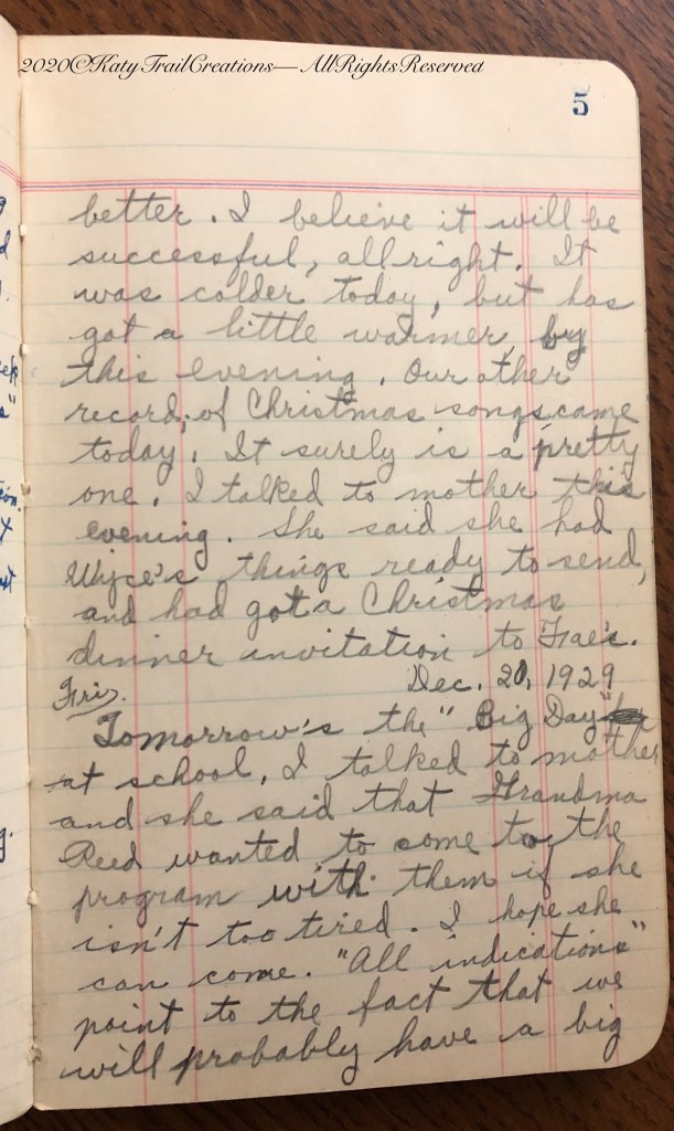 Tomorrow is the “Big Day” at school. I talked to mother and she said that Grandma Reed wanted to come to the program with them if she isn’t too tired. I hope she can come. “All indications” point to the fact that we will probably have a big …….