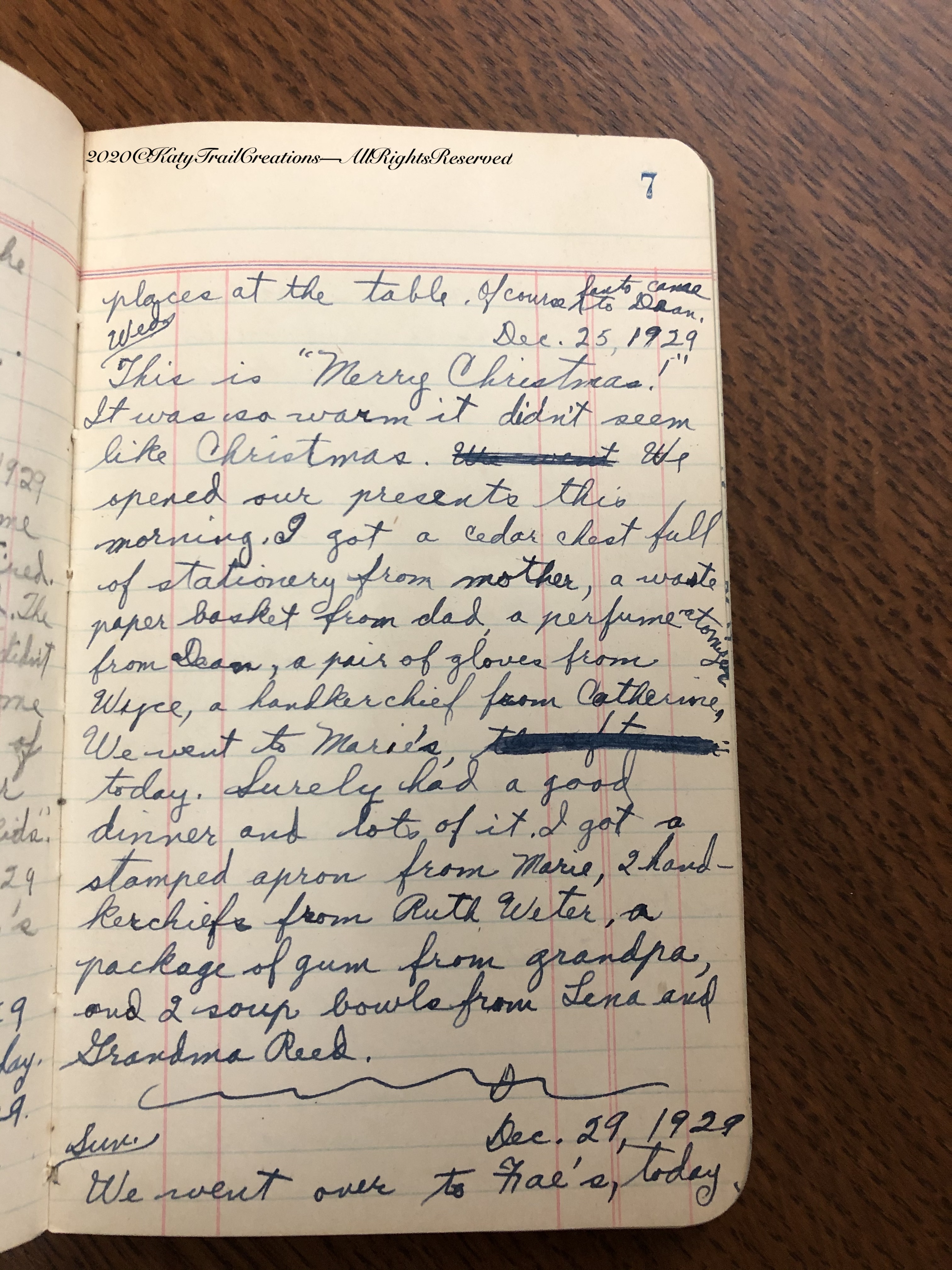 This is “Merry Christmas!” It was so warm it didn’t seem like Christmas. We opened our presents this morning. I got a cedar chest full of stationery from mother, a waste paper basket from dad, a perfume atomizer from Dean, a pair of gloves from Wyce, a handkerchief from Catherine. We went to Marie’s today. Surely had a good dinner and lots of it. I got a stamped apron from Marie, 2 handkerchiefs from Ruth Weter, a package of gum from grandpa,and 2 soup bowls from Lena and Grandma Reed.