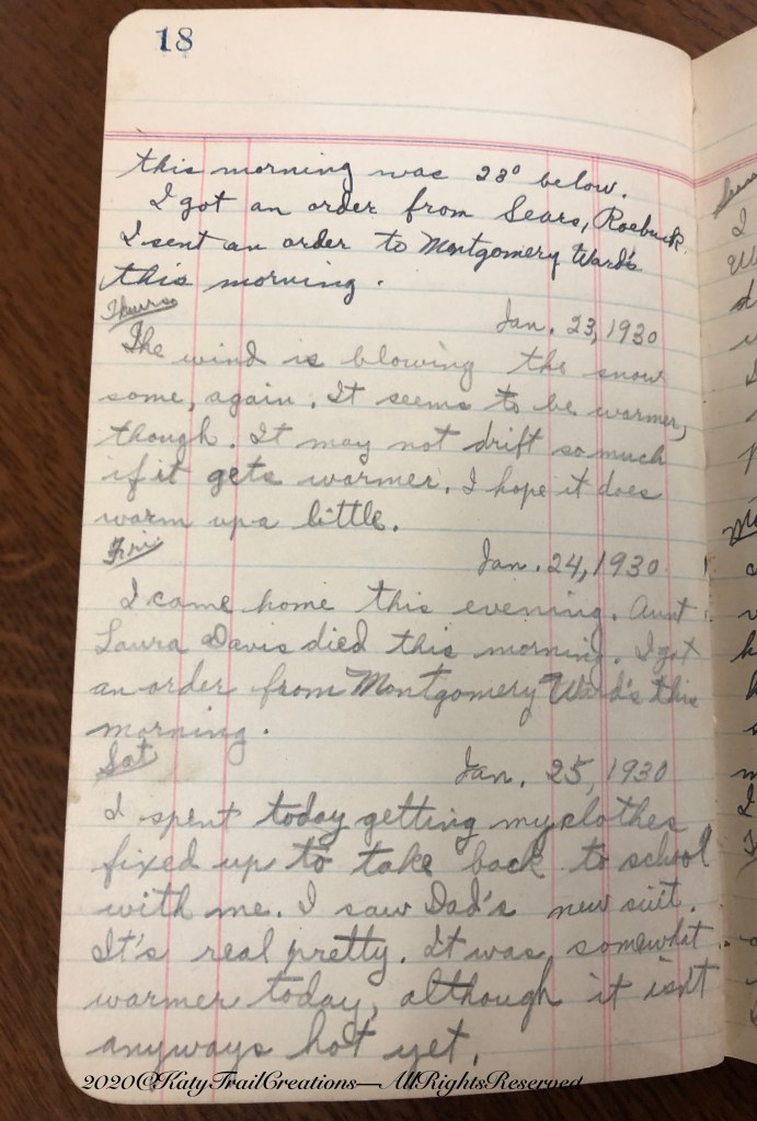 I came home this evening. Aunt Laura Davis died this morning. I got an order from Montgomery Ward’s this morning.