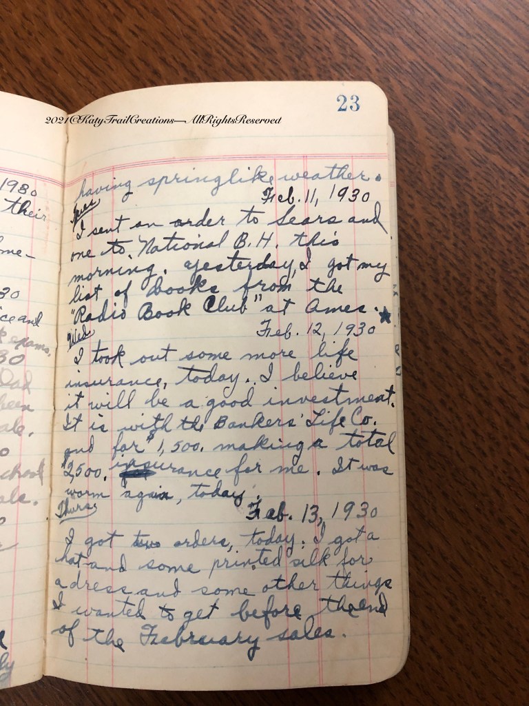 Wed. Feb 12, 1930 I took out some more life insurance, today. I believe it will be a good investment. It is with the Banker’s Life Co. and for $1500 making a total $2500 insurance for me. It was warm again today.