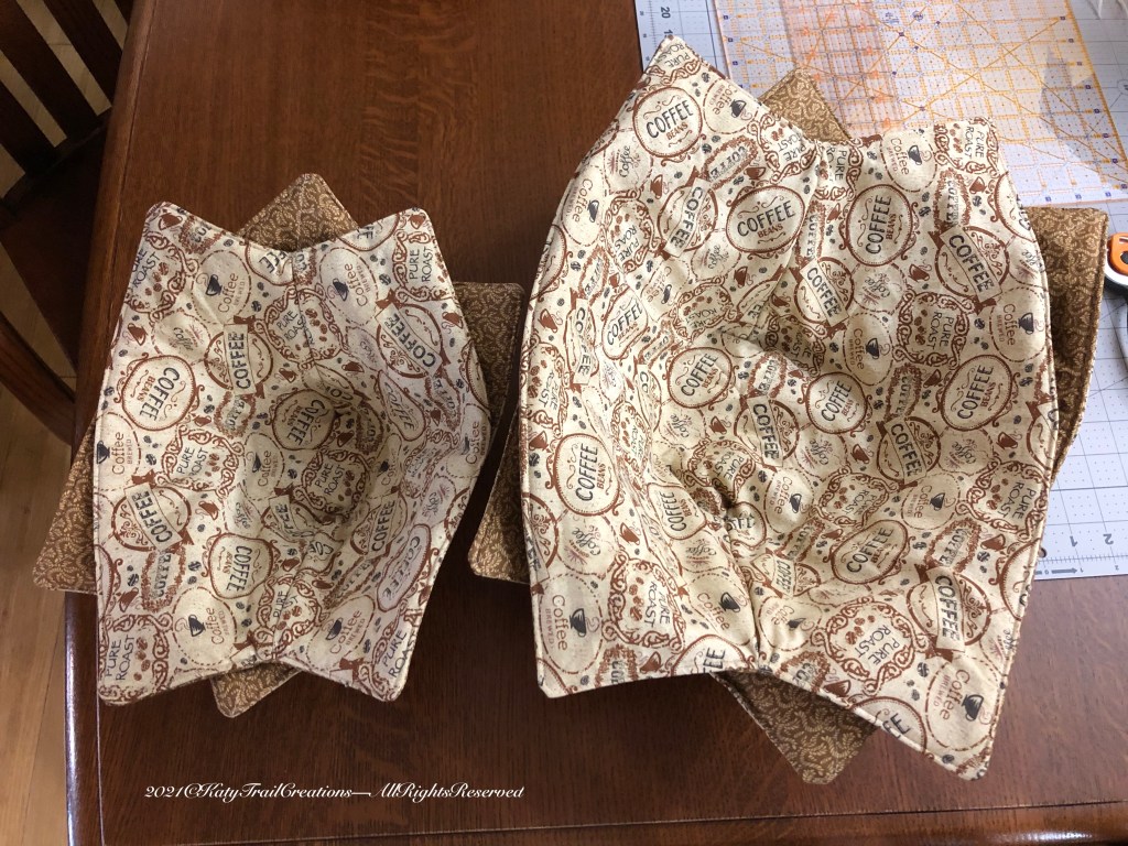 One benefit to doing all that homework was that Inez knew how to do math. (Not my best subject) And I was able to grasp fraction work thanks to her. Let’s not even think about Algebra. Nope. But, thankfully this past week, those math lessons came in handy when I was able to use ratios to increase the size of my bowl cozies to fit larger bowls. Had a request for the ones I’m about to show you. Normally mine are for cereal/soup-sized bowls. These are for larger bowls and will be lovely for a tablescape, keep things warm, minimize spills and just give a nice touch when having company over. Coffee was the requested fabric theme. What themes you use are only limited by fabric shortage. 😉