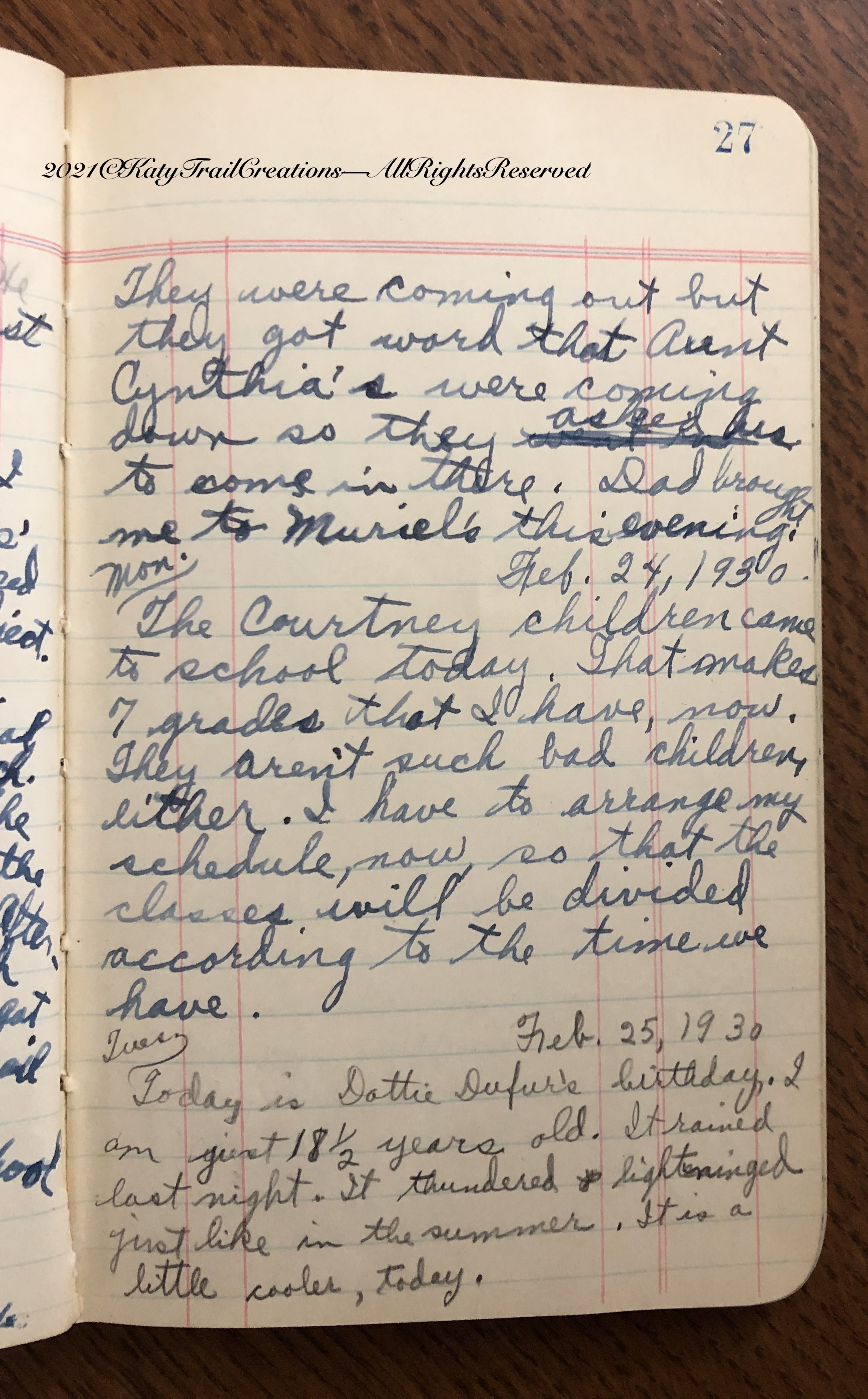 Mon. Feb 24, 1930 The Courtney children came to school today. That makes 7 grades that I have, now. They aren’t such bad children, either. I have to arrange my schedule, now so that the classes will be divided according to the time we have.