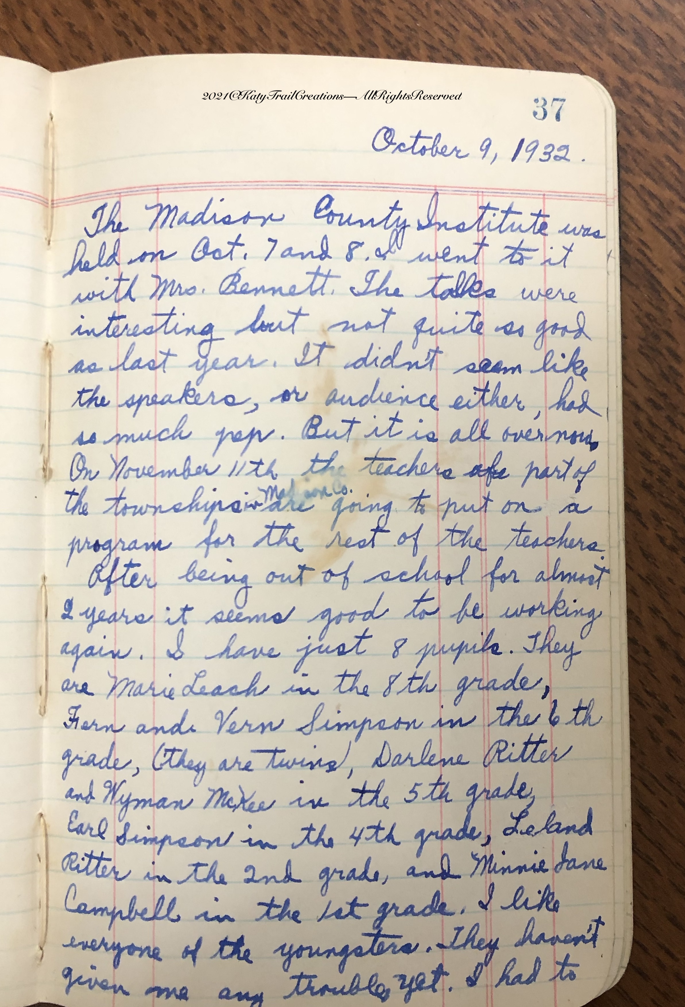 After being out of school for almost 2 years, it seems good to be working again. I have just 8 pupils. They are Mary Leach in the 8th grade, Fern and Vern Simpson in the 6th grade, (they are twins), Darlene Ritter and Wyman McKee in the 5th grade, Earl Simpson in the 4th grade, Leland Ritter in the 2nd grade, and Minnie Jane Campbell in the 1st grade. I like every one of the youngsters. They haven’t given me any trouble yet. I had to……
