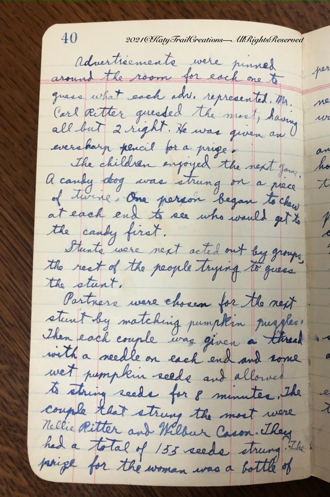 Partners were chosen for the next stunt by matching pumpkin puzzles. Then each couple was give a thread with a needle on each end and some wet pumpkin seeds and allowed to string seeds for 8 minutes. The couple that strung the most were Nellie Ritter and Wilbur Cason. The had a total of 155 seeds strung. The prize for the woman was a bottle of…….to be contd.