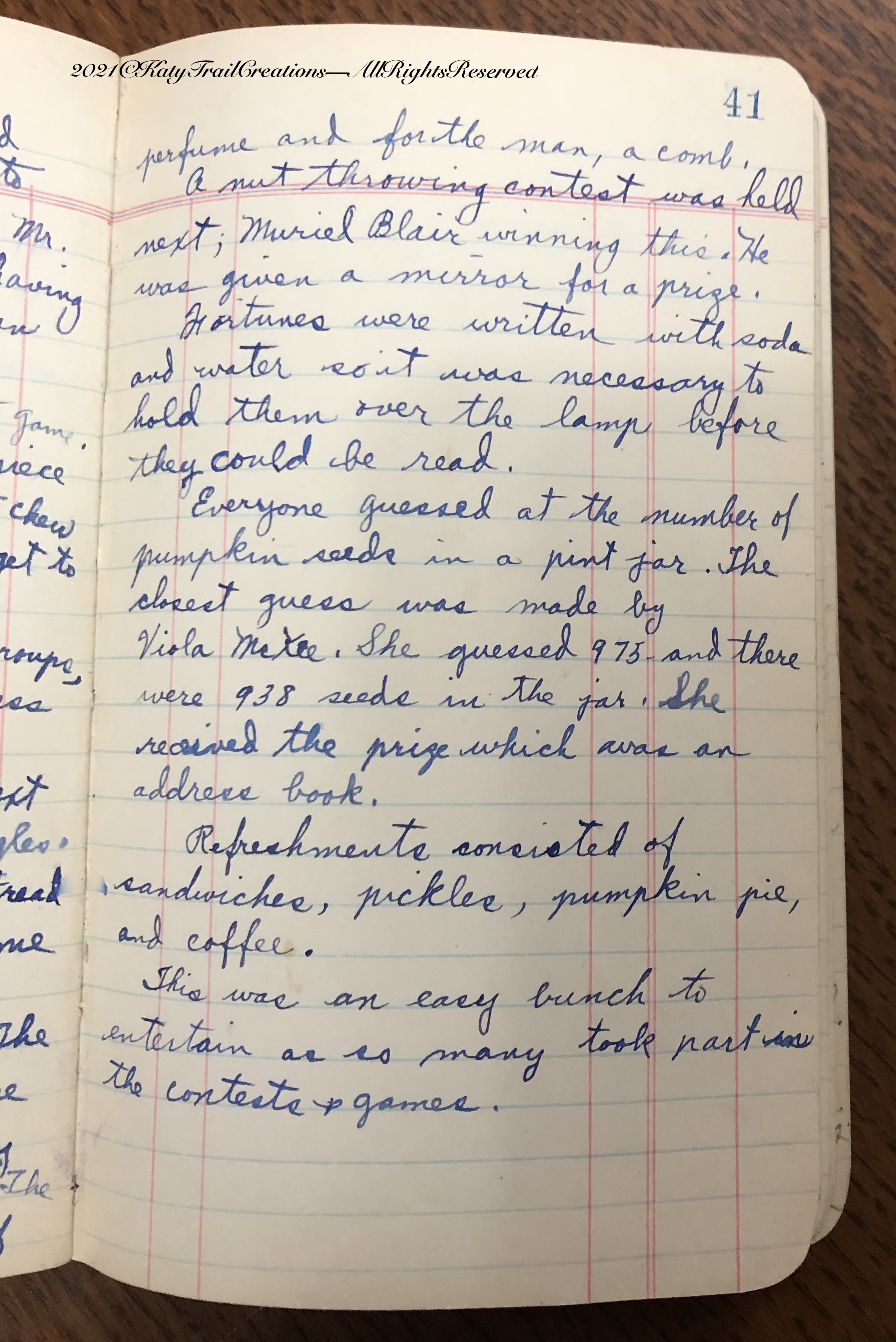 Plenty of food for thought with her final entry of the 1932 Halloween party. It must have been the talk of the school district for quite some time! Do you remember the old movie scenes where they discovered secret messages? I remember grandma showing the baking soda method to us grandkids. We’d spend hours with paper and paintbrush in hand, writing ‘clues’ for hidden items. Does anyone do that anymore?