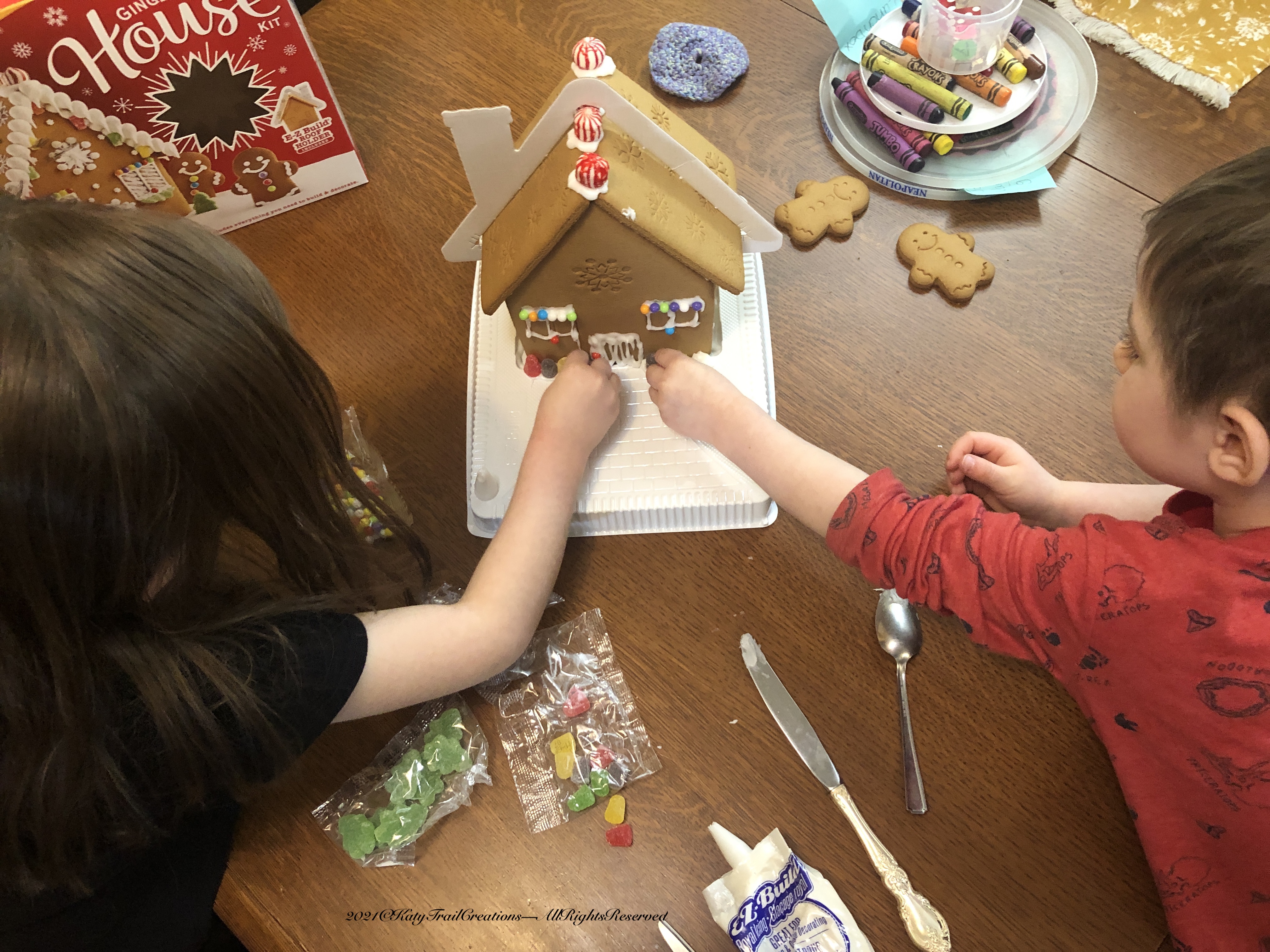 Mother donated the gingerbread house/cookie kit for our enjoyment. Also a wonderful way to enhance cooperation, fine motor skills, early math concepts and spacial awareness– in case you were wondering.