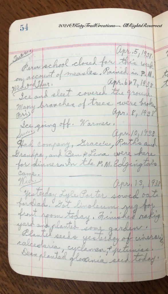 Wed. April 13, 1938 Yesterday Lyle Porter sowed oats for Dad. Got linoleum rug for front room today. Finished raking yard and planted some garden. Planted seeds yesterday of cinerarian, calceolaria, cyclamen, & petunias. Dean planted gloxania seed today.