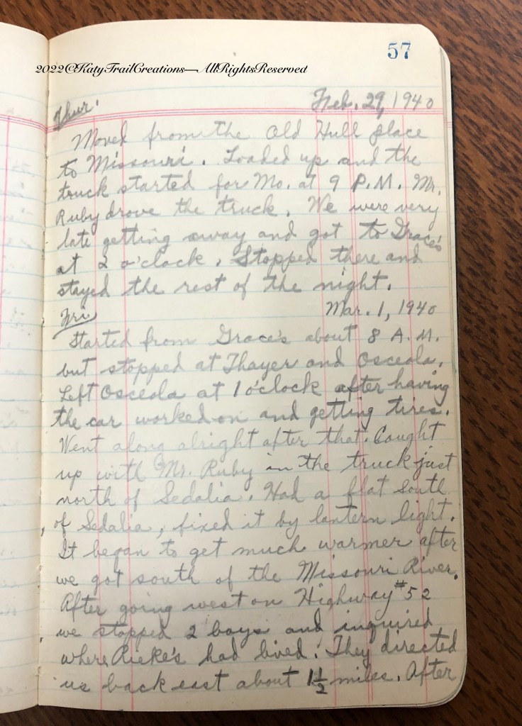 Thurs, Feb. 29, 1940 ~~~Moved from the Old Hull Place to Missouri. Loaded up and the truck started for Mo at 9 P.M. Mr. Ruby drove the truck. We were very late getting away and got to Grace’s at 2 o’clock. Stopped there and stayed the rest of the night.