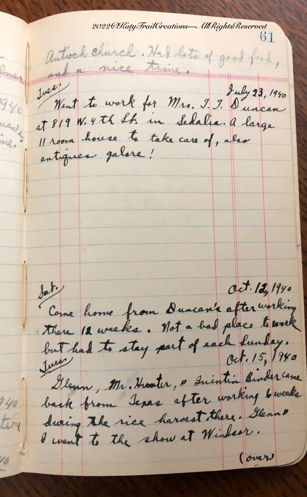 Tues. July 23, 1940 ~~~ Went to work for Mrs. J.J Duncan at 819 W. 4th St. in Sedalia. A large 11 room house to take care of, also antiques galore!