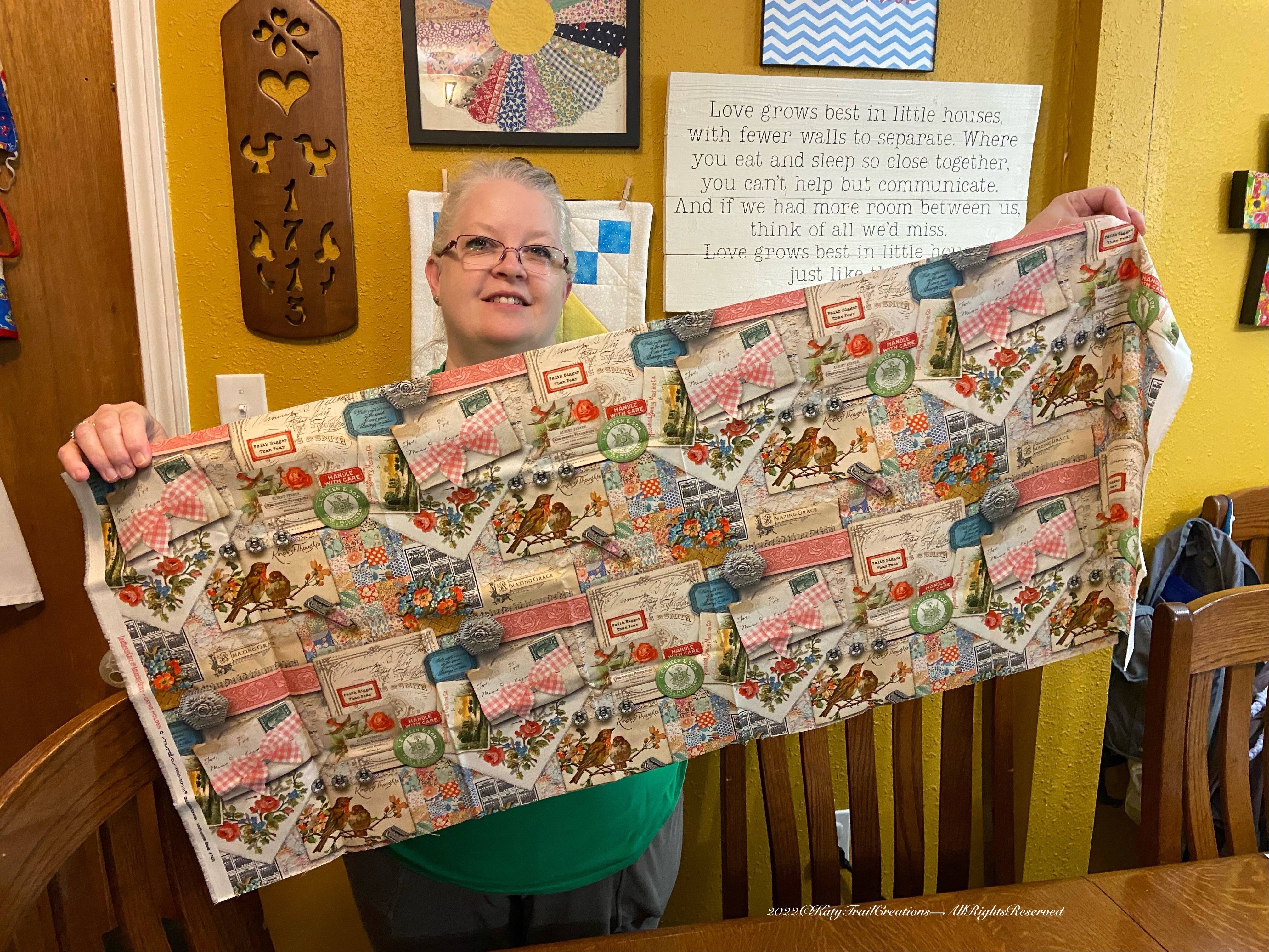 Today is International Day of Happiness. So let us go forward with this theme and learn about the focus of this day. People are encouraged to use this day as a time to reflect on what makes them happy, and how one can change the world through this. So for me personally, I would like to draw attention to the people at Quilter’s HQ in Overland Park, Kansas. Each week they do a little one-hour livestream called Make It Sew. You can find it either on YouTube or FaceBook. There’s usually a fun project and a new quilt-a-long. Also find out about new sewing or quilting notions or even partake in one of their fabric sales. And let’s just take a moment to reflect on the fact that there have been Wayyyy too many hard-to-find fabrics And price increases on said fabrics since 2020. And to top off this goodness, they have a ‘door prize’ of something sewing/quilting related. Guess who won the latest door prize??? Yes, Your’s Truly. And little did I know how lovely this would look in person. So here’s a photo. No judgement on the bad hair day, please. Workday hair–just don’t care.