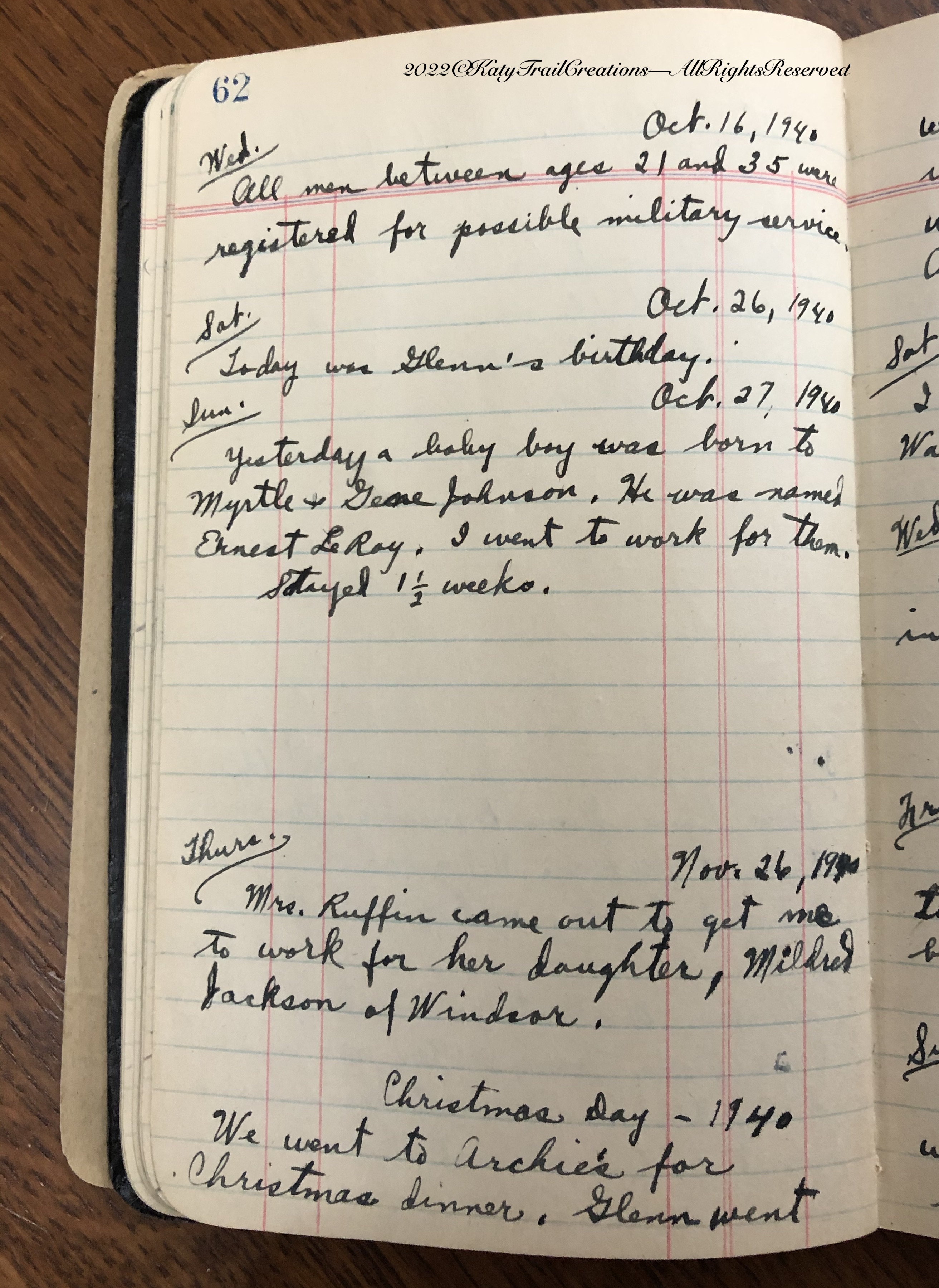 Sun. Oct. 27, 1940 ~~~ Yesterday a baby boy was born to Myrtle and Gene Johnson. He was named Ernest Leroy. I went to work for them. Stayed 1 1/2 weeks.