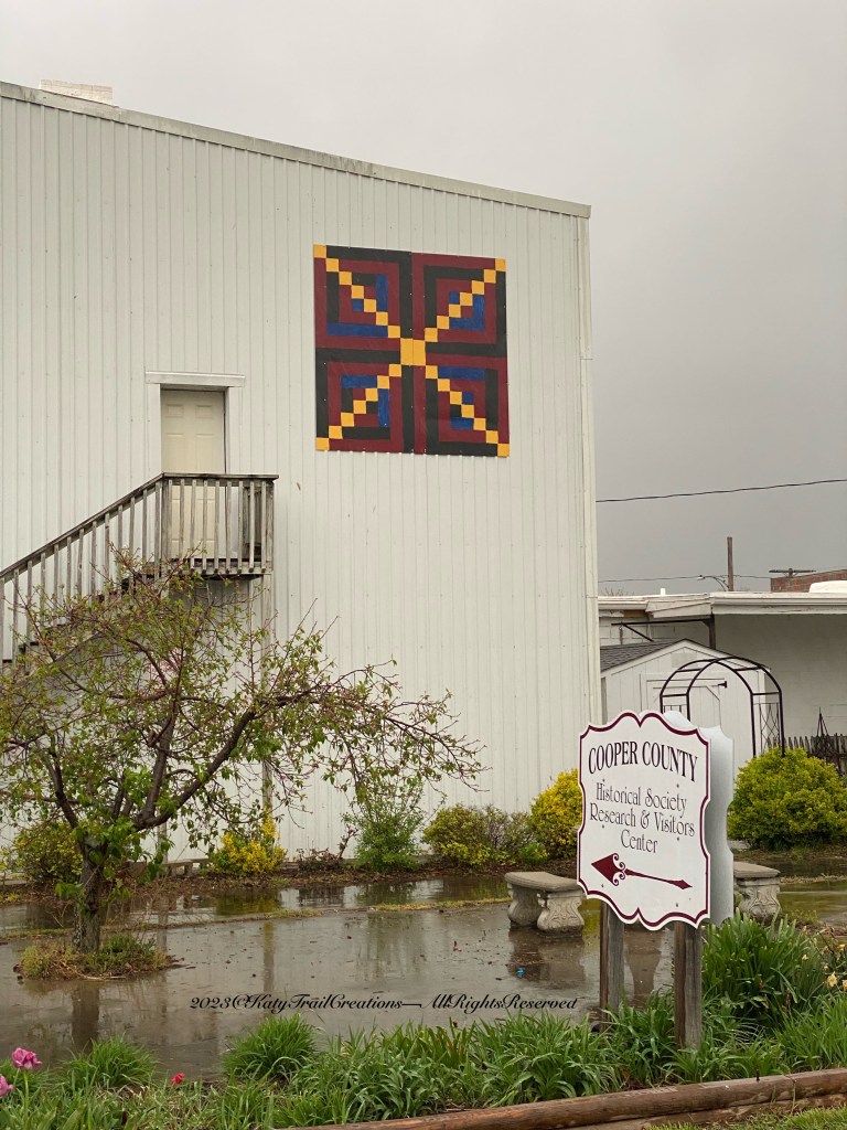 The quilt block, named “Pilot Grove Crossings,” is attached to the east wall of the Cooper County Historical Society Research Center in Pilot Grove. It’s not a traditional quilt block like the “Grandmother’s Flower Garden” or “Sunbonnet Sue”. It is unique, in that it is deliberately very historic in it’s design, and is meant to tell the story of the early history of Cooper County, and the travel routes that ran through the area.