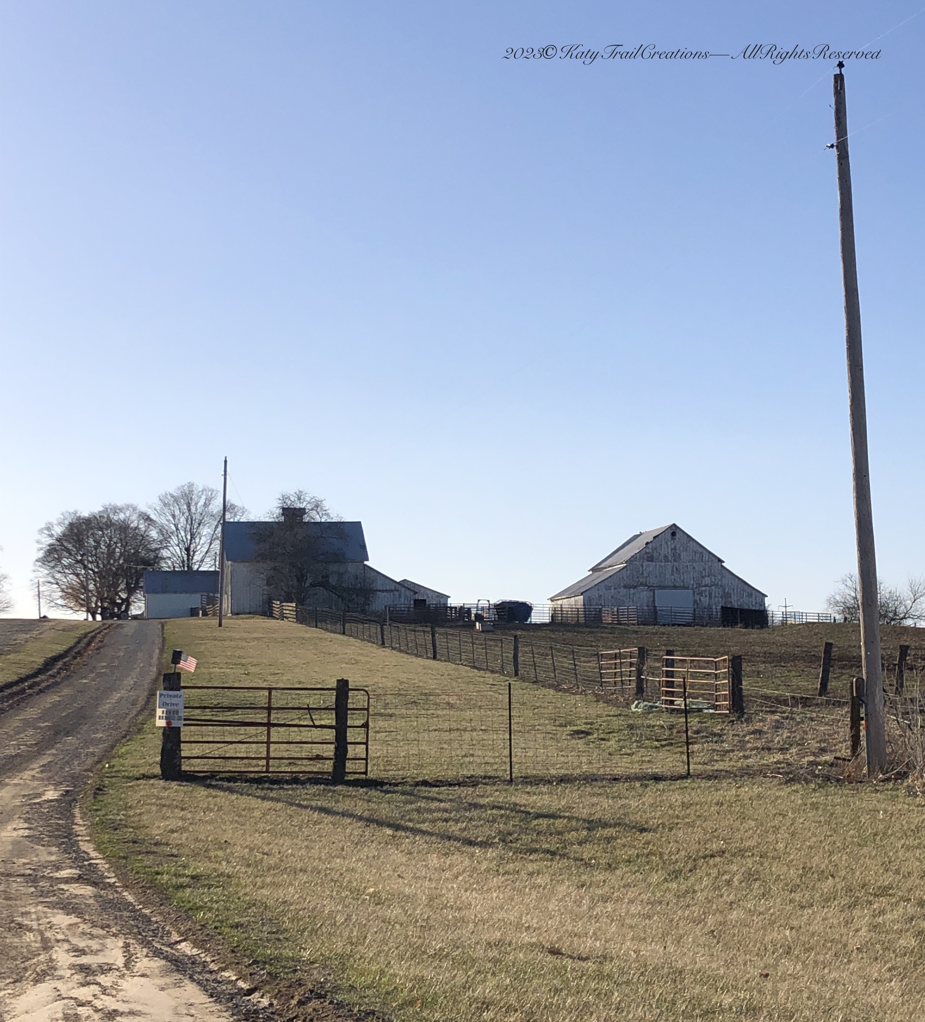 The doors on the far-right barn are newer which signals it is still a well-used barn. Several gates and even a mini flag flying at the entry to that long lane. I bet that makes a great sledding hill in winter! Just don’t crash land into that gate. Mom thoughts.