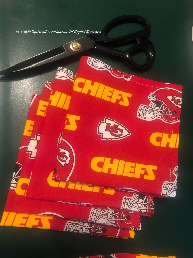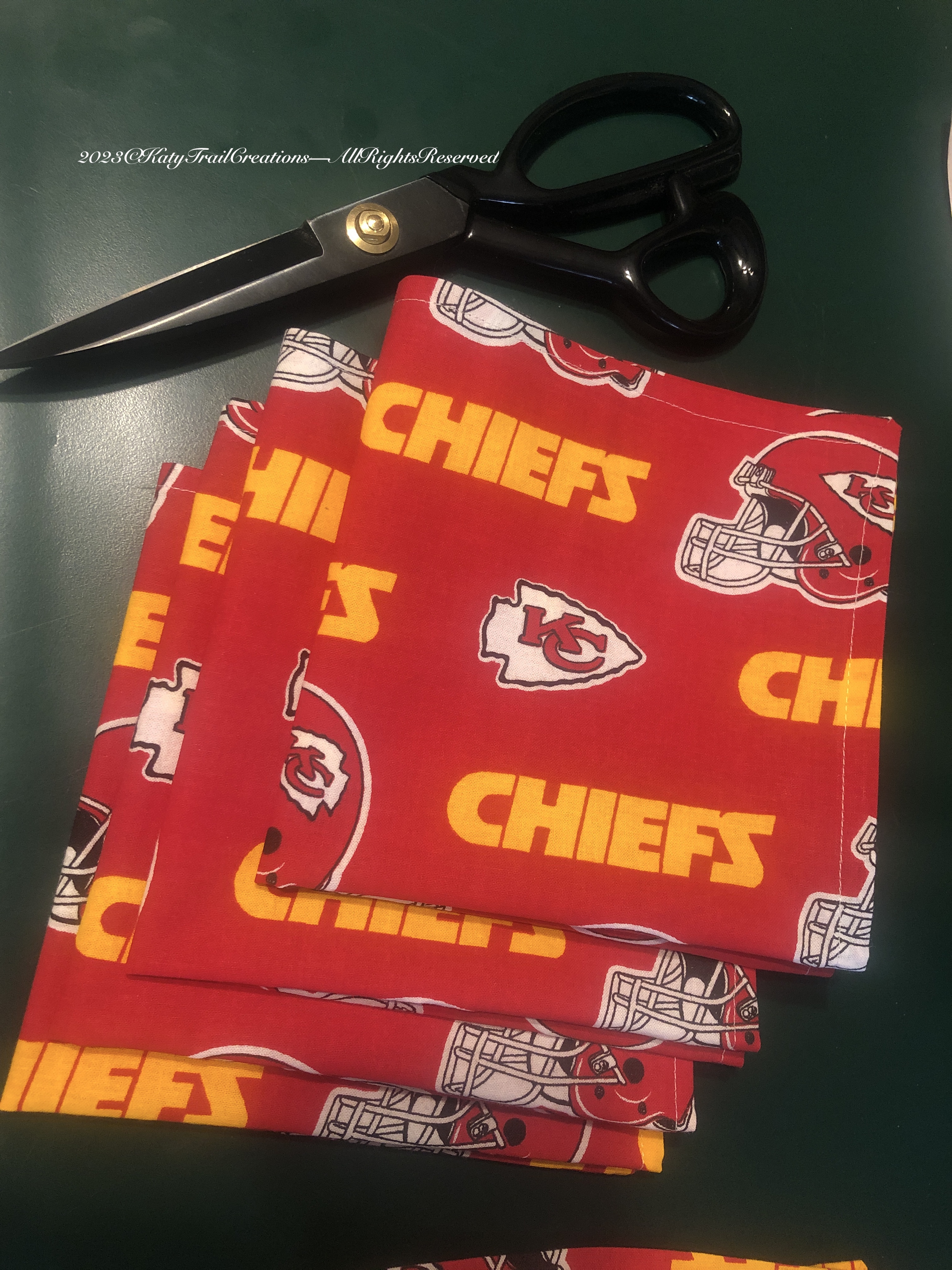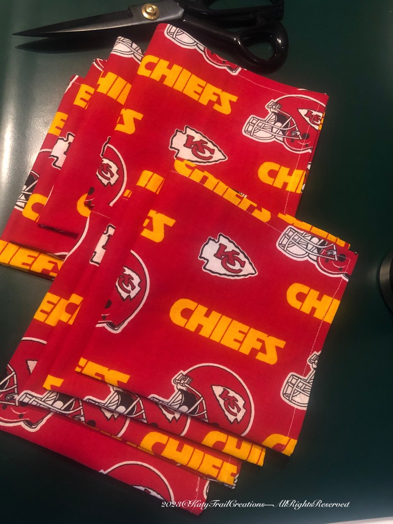 In my world of sewing at home, had a custom order request for some Dinner Napkins made with Kansas City Chiefs fabric. Dinner napkins typically measure 12 x 12. This team fabric is one of the better ones I’ve ever worked with. Not just because I’m their number 1 fan (haha), it’s really a good sturdy fabric! Finished and ready to mail this afternoon.