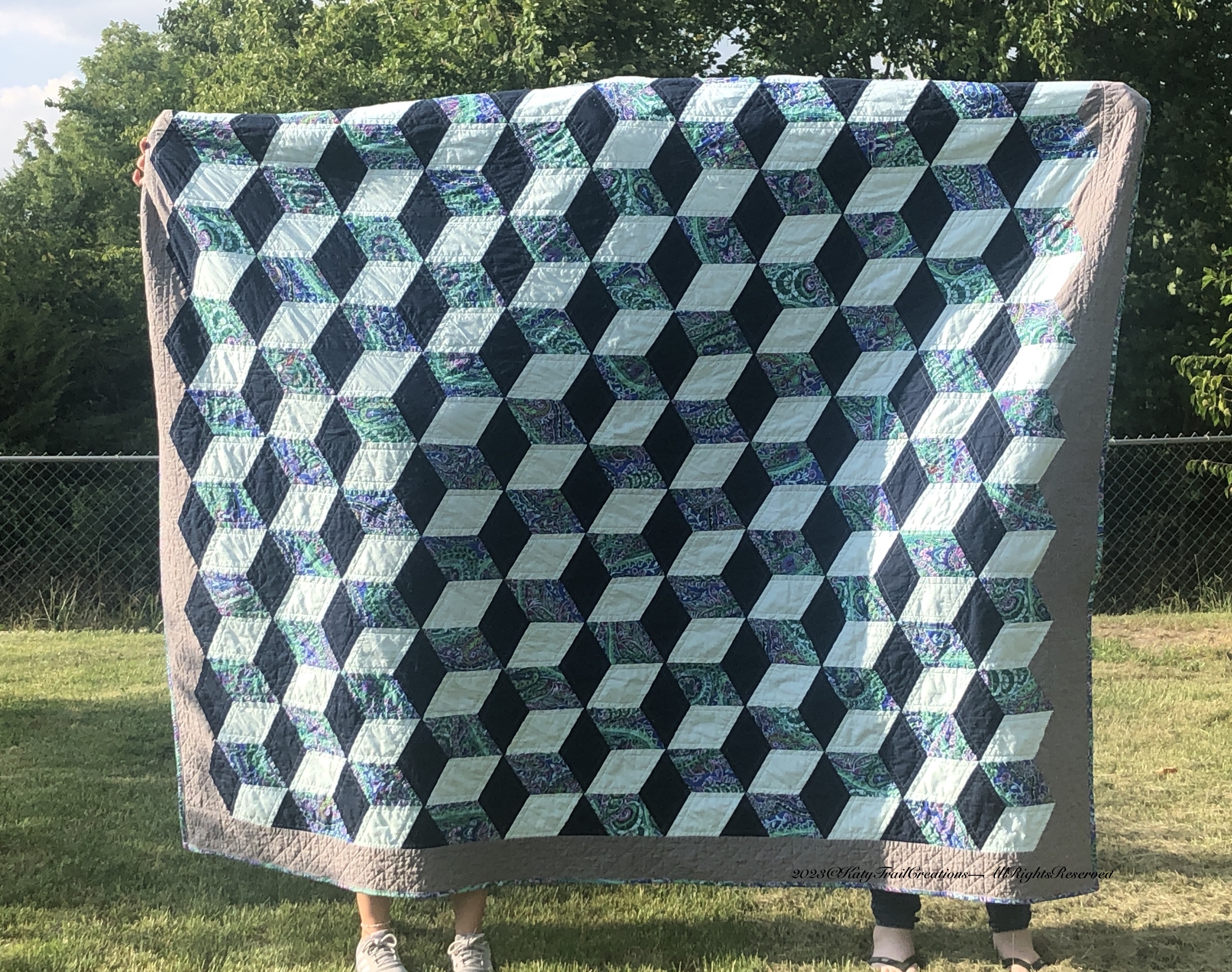 I promised a few people a final view of the commissioned Tumbling Block quilt. Special thanks to my youngest daughter and her friend for helping me with the display. I think the feet at the bottom of the photo ought to make anyone smile 🙂 Happy Friday everyone