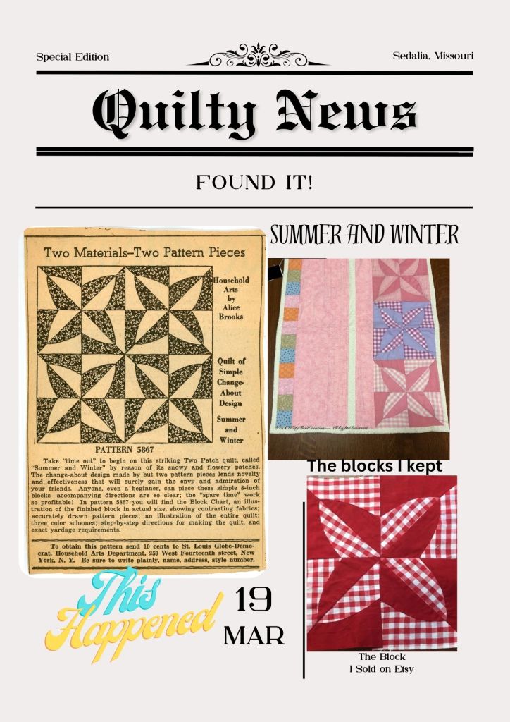 So we have a name. Actually 2. But we will go with the original from a Clipping they sent me from the St. Louis Globe-Democrat from sometime after 1937. It is also in Barbara Brackman’s Encyclopedia of Pieced Patterns. (Gotta get me this book!) Oh, I’ll go ahead and share both names for posterity’s sake. “Twist and Turn” is also known as “Summer and Winter.” There are many quilt blocks that carry the same name over the years so this isn’t anything unusual. Take a look at the article below and the photos by clicking as it will enlarge for your reading enjoyment.
