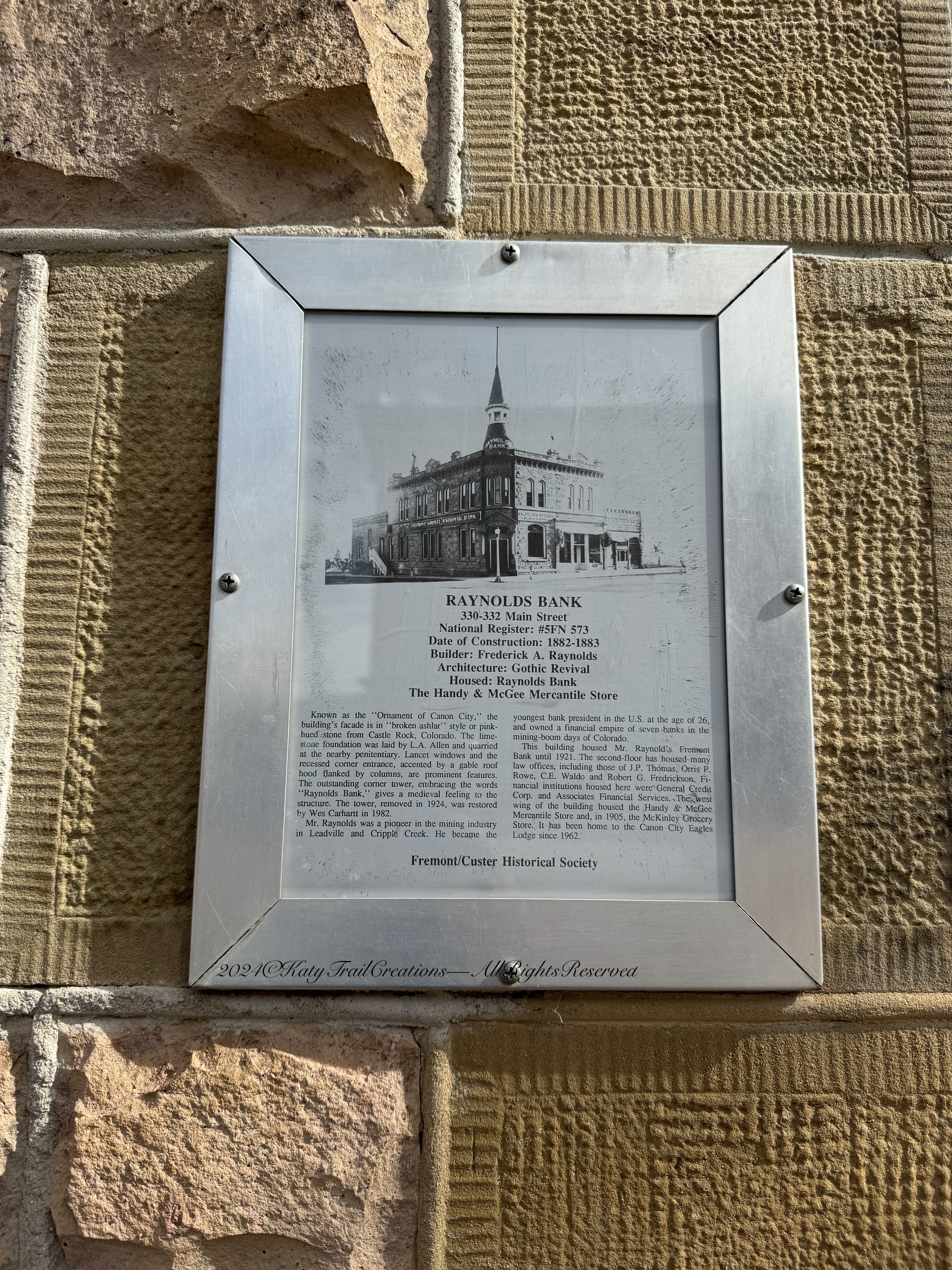 Known as the “Ornament of Canon City,” the building’s facade is in “broken ashlar” style or pink-hued stone from Castle Rock, Colorado. The limestone foundation was laid by L.A. Allen and quarried at the nearby penitentiary. Lancet windows and the recessed corner entrance, accented by a gable roof hood flanked by columns, are prominent features. The outstanding corner tower, embracing the words “Raynolds Bank,” gives a medieval feeling to the structure. The tower, removed in 1924, was restored by Wes Carhartt in 1982.