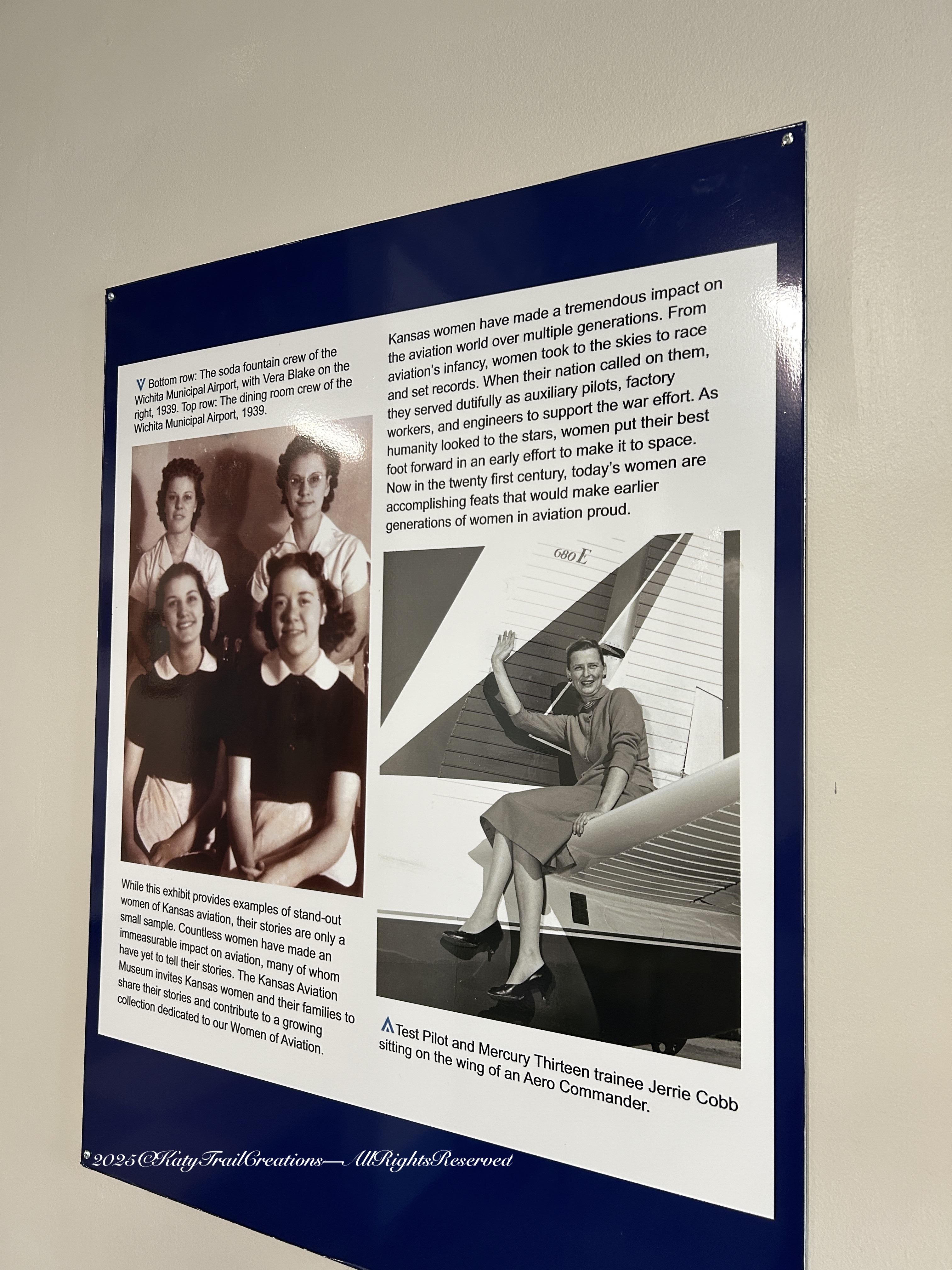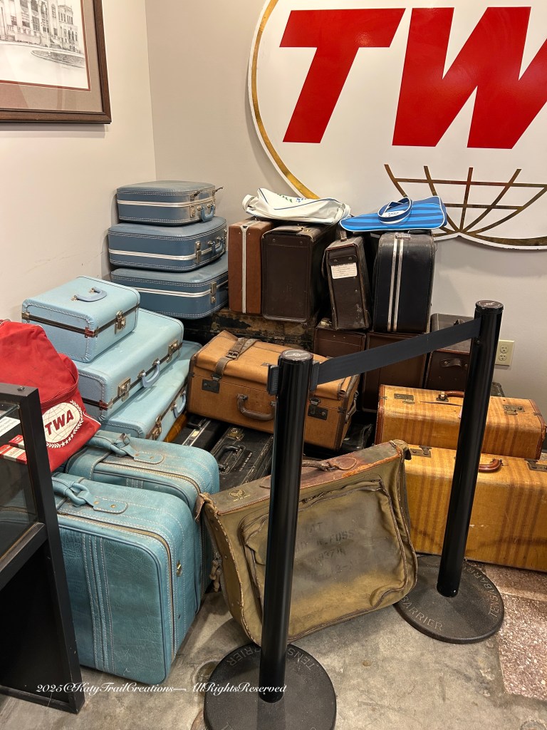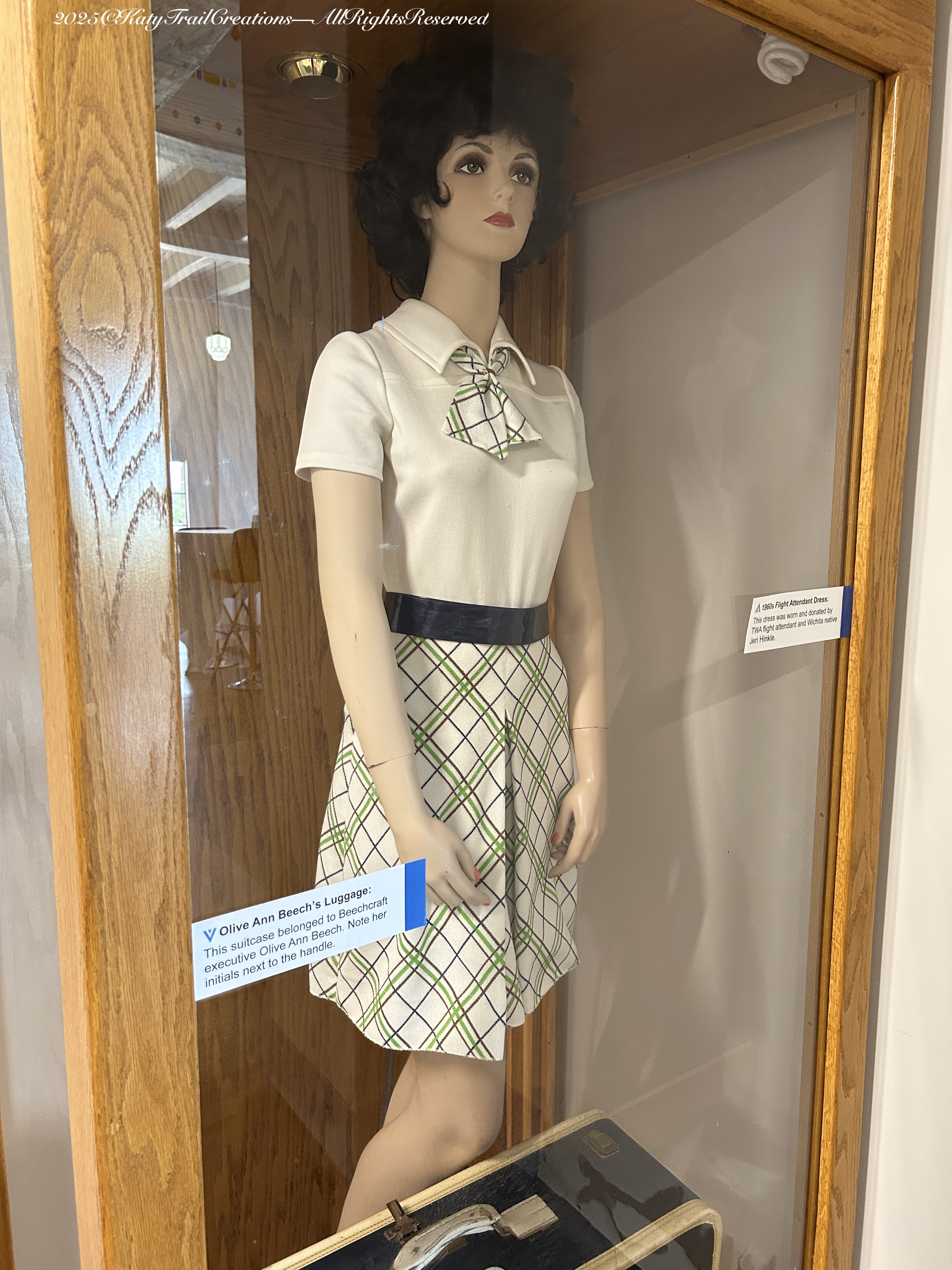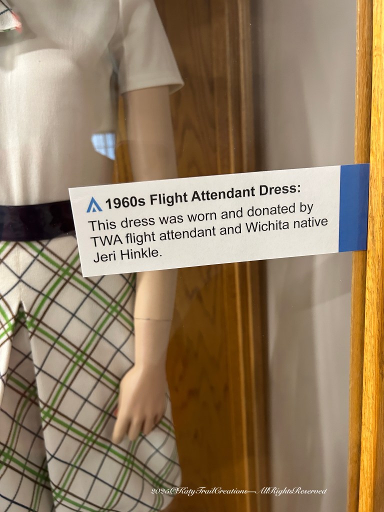 Continuing on the Kansas Aviation Museum tour this weekend. Thursday Doors on a Saturday once again with many goings on. More on that in a future post. So let’s get to the photos of the exhibits showing female contributions — and those uniforms! Being the fabric connoisseur, I could not resist focusing on the couture outfits women were obliged to wear for work. I decided to put my thoughts in the captions for ease of reading and hope you’ll click to discover the details.