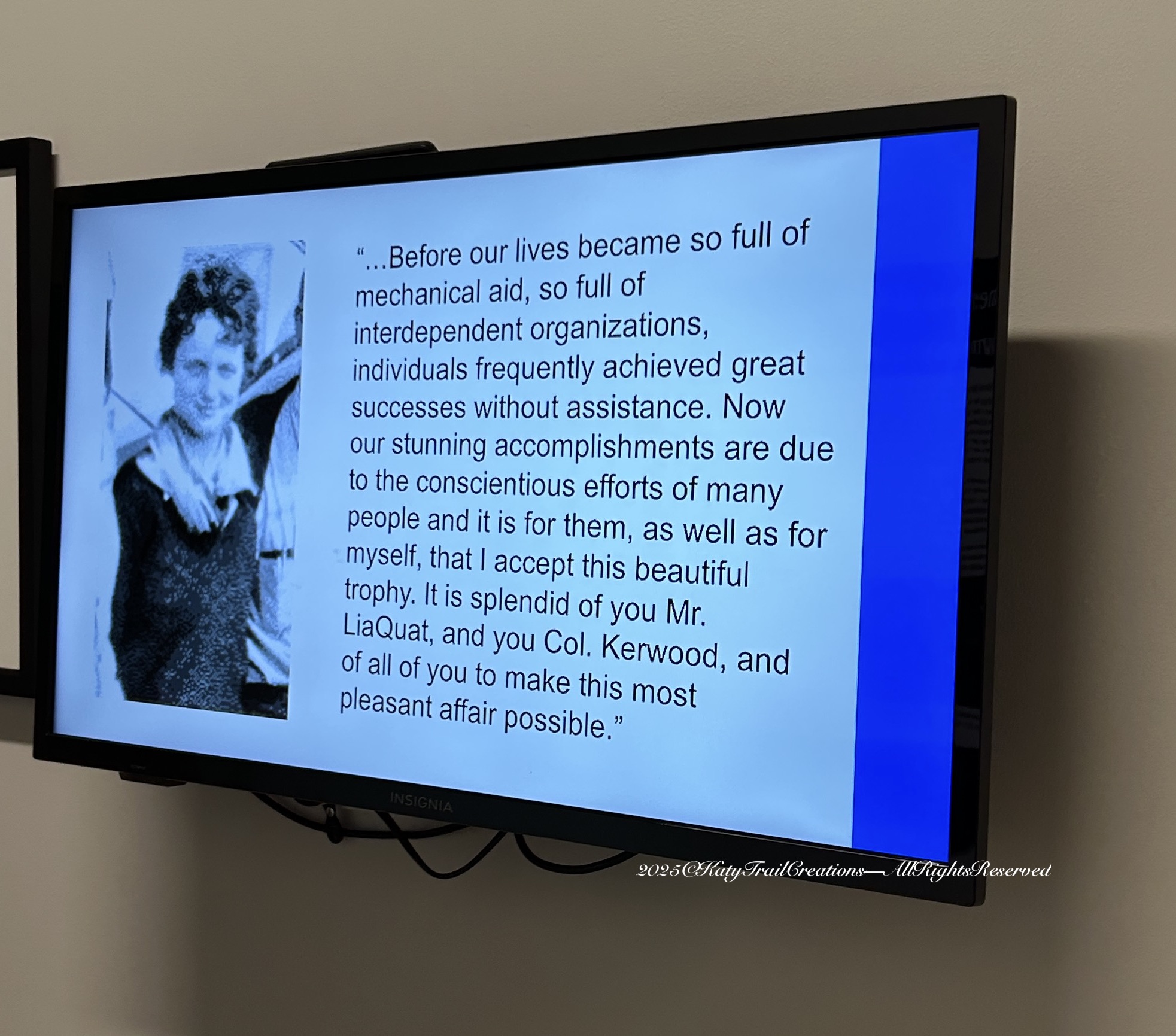 Transcontinental Air Transport eventually became TWA. Clement Melville Keys founded it in 1928. He’s not mentioned above in the display. However, Charles Lindburgh is. The property that the museum now sits was formerly property of McConnell and was a refueling stop for this airline. I thought the above photo was a good one of Amelia. The words she spoke were to President Roosevelt, one year before her disappearance.