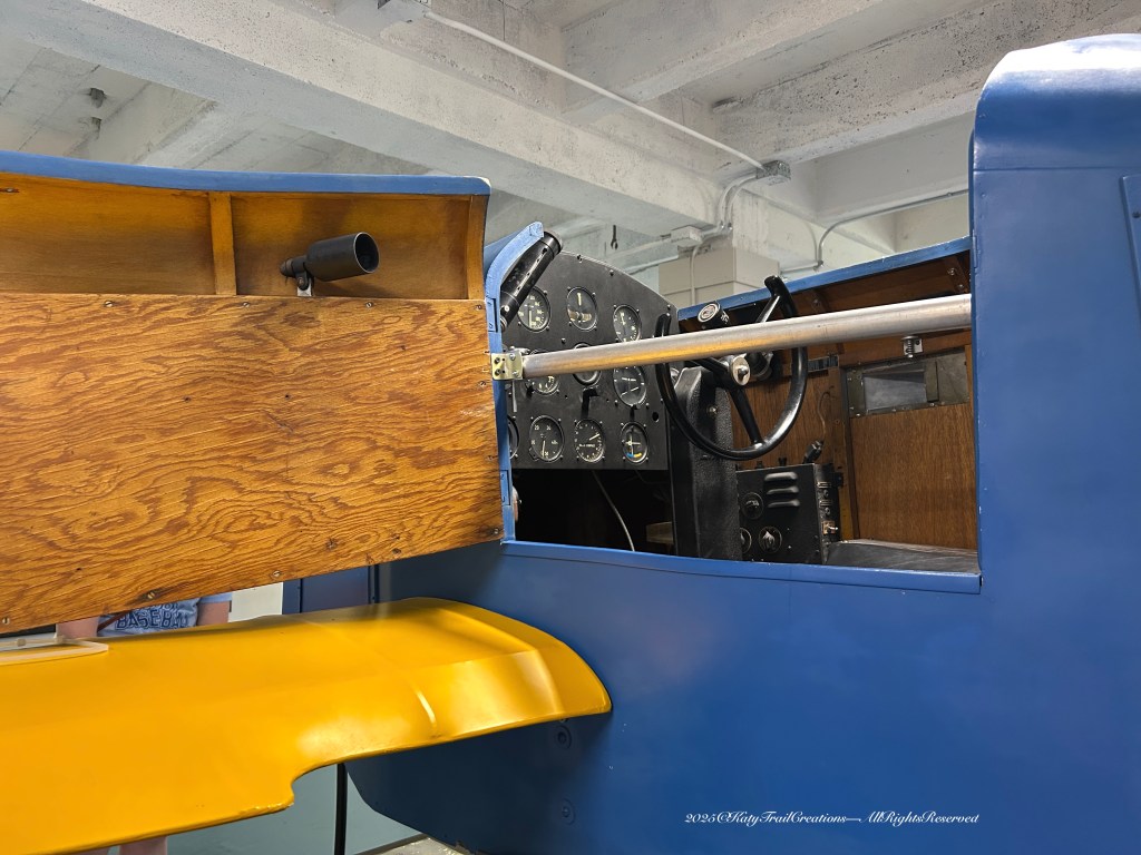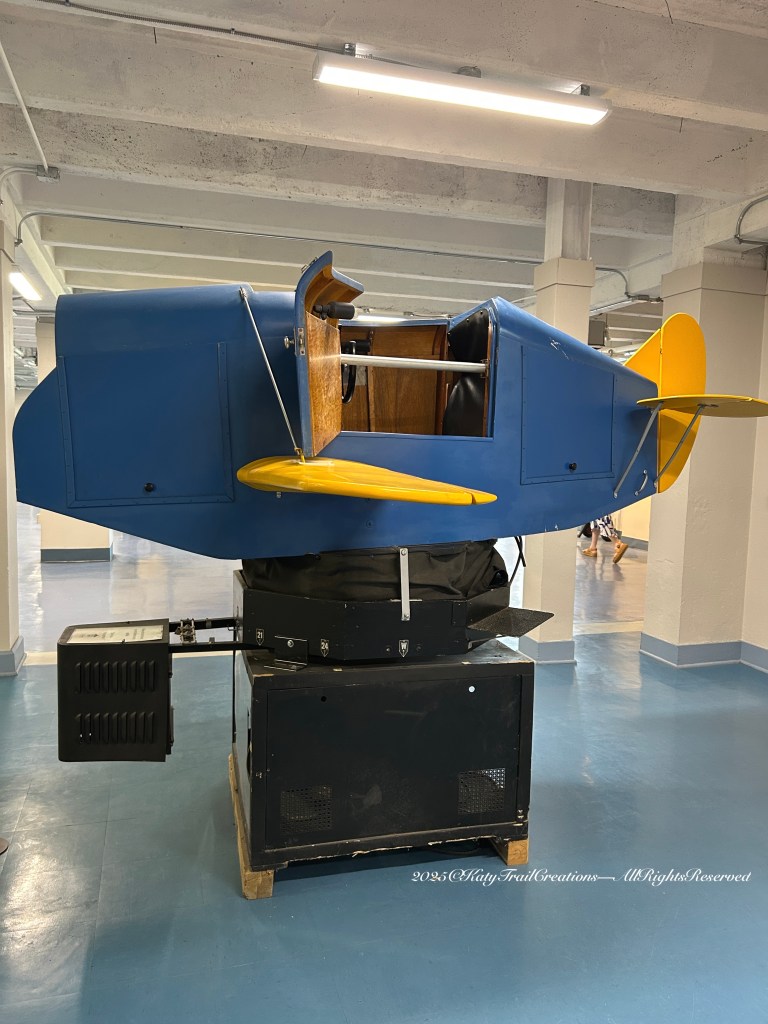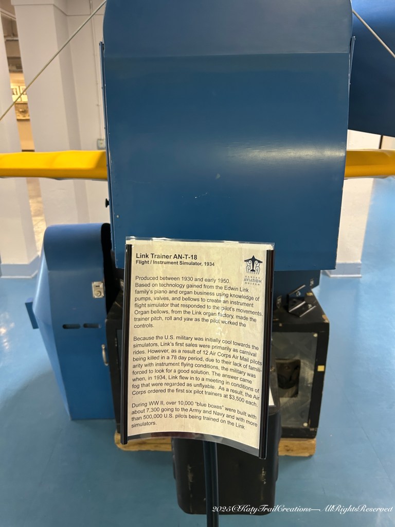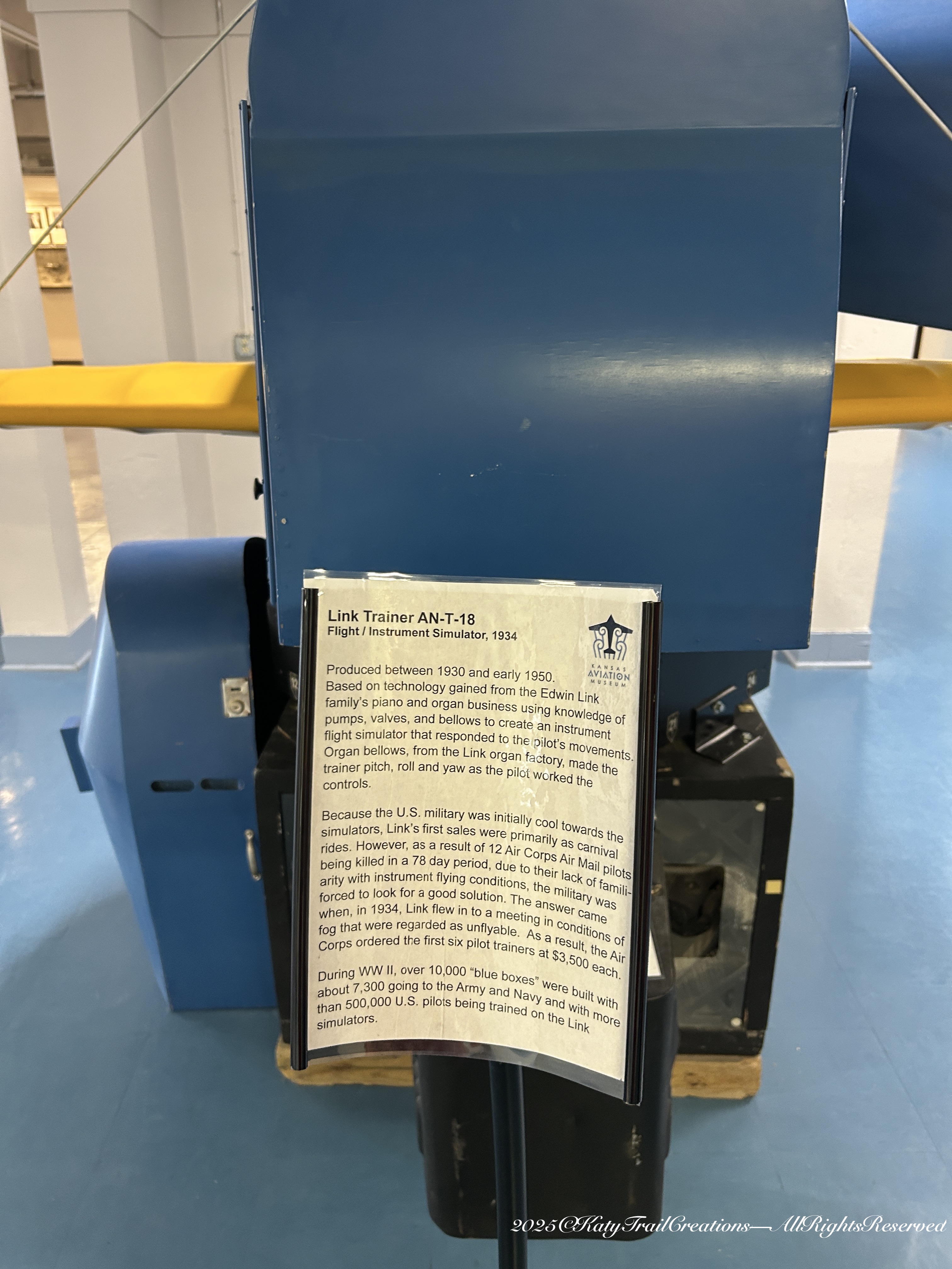 They really did well with visual appeal throughout this museum. And the history just kept continuing on and on. Below I have pics of a WWII Trainer that began its use for the Air Mail Corps. I was intrigued by it mainly because the idea for it began with the “parts” of an organ. The knowledge of bellows, valves and pumps used in a family-ran piano and organ business jumpstarted the makings of this trainer. Another check mark beside “music saves lives” in my humble opinion.