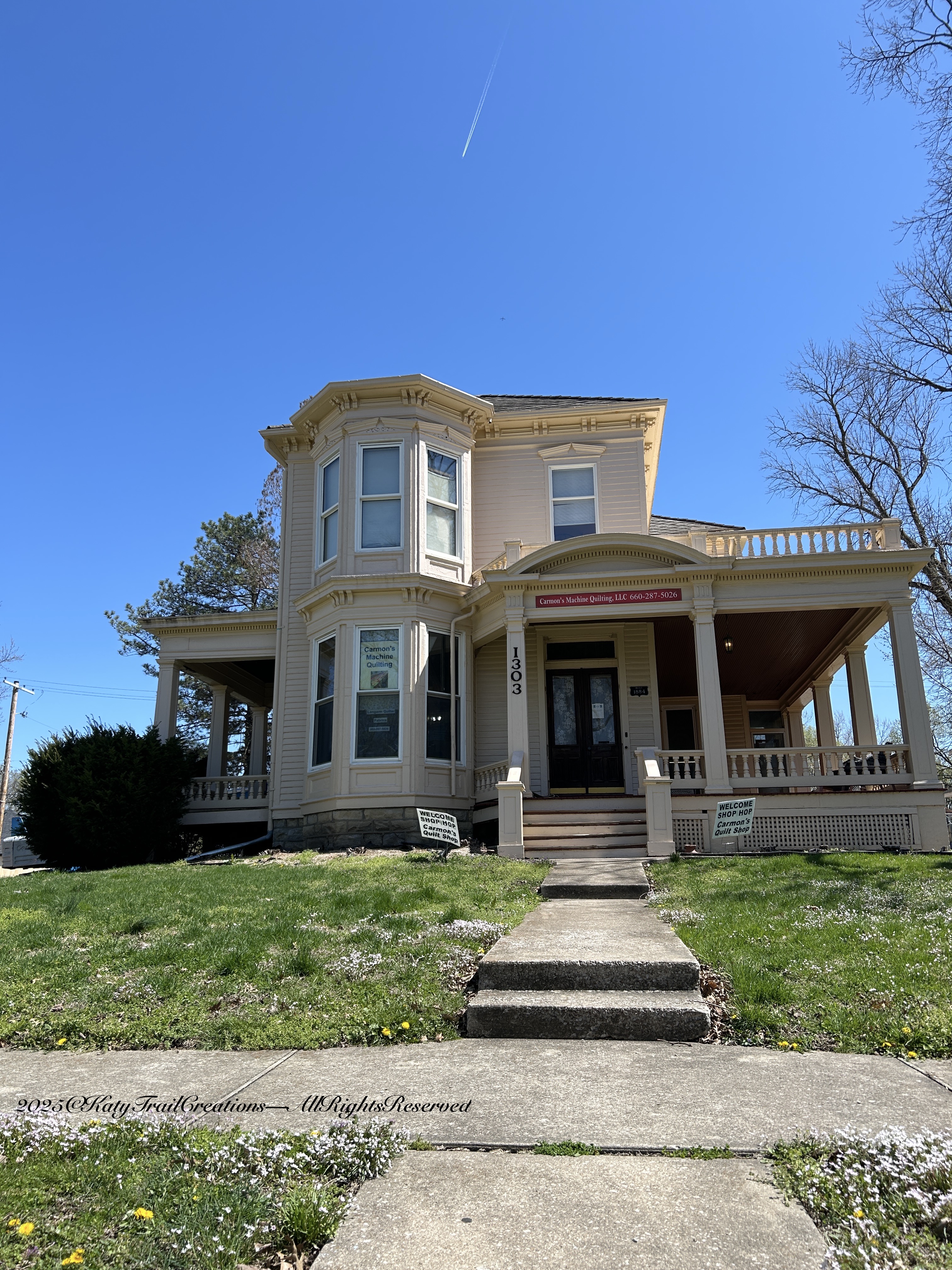 The quilt is amazingly beautiful, as is the house and the doors. I doubt the porch wrapped around. The turret is a signature element and I’ve never seen a porch in front of them. I don’t know how old the house is, but the smaller porch on the left of the turret might have been to protect people entering and existing from a carriage coming from or heading to a carriage house in the back. That’s my guess, but I have nothing to back that up.