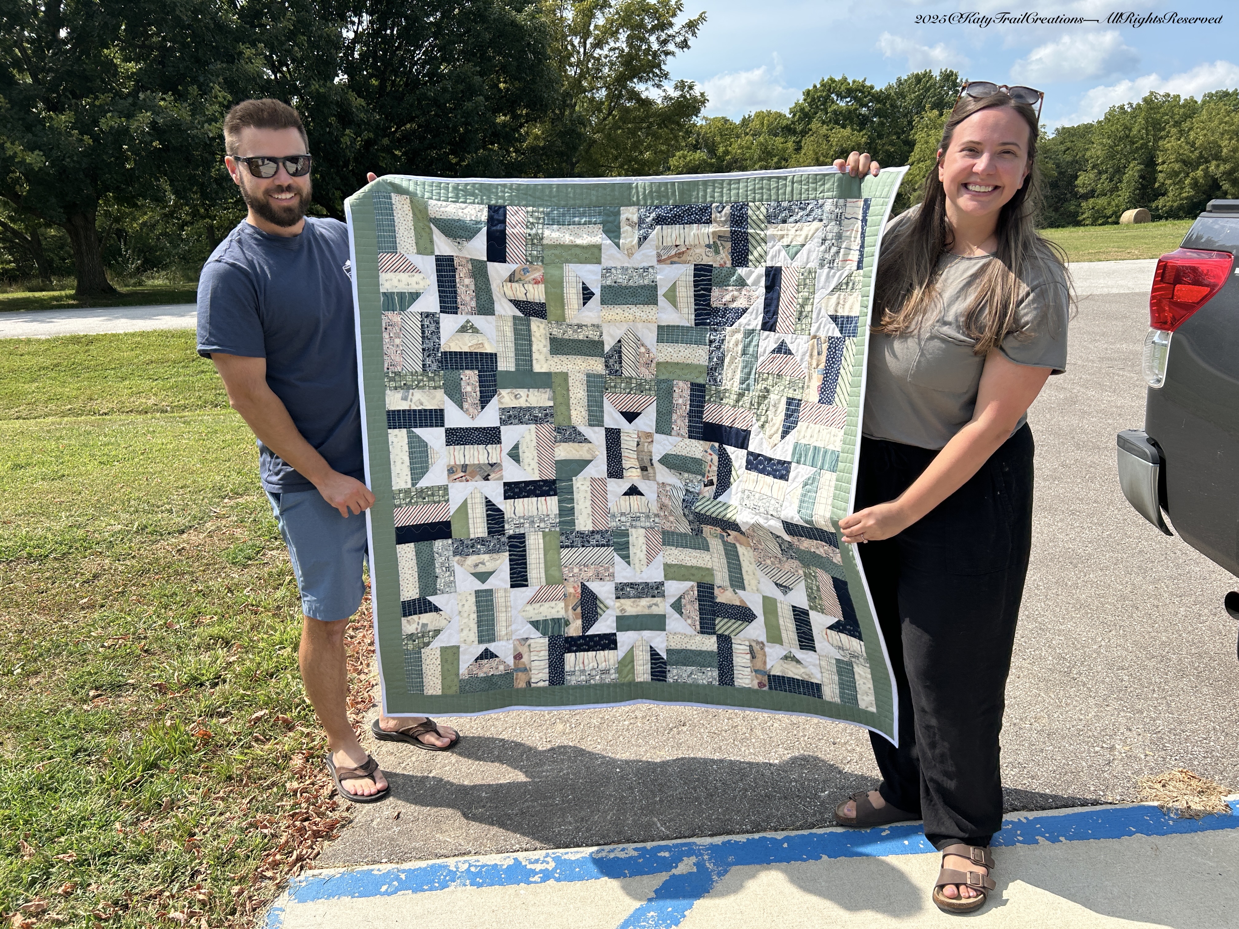 Now the reason for the shop visit was to find a match for a border on a quilt I was gifting. And it was a perfect color match thankfully. Below is the pic of the recipients of my Rail Fence Star quilt using a jelly roll of BonVoyage fabric line by Moda. The jelly rolls were from another quilt shop and the pattern is from Missouri Star Quilts. I clearly support all the quilt places that I can. Especially since losing that J****** store. I refuse to name them anymore in writing. sorry not sorry. & yes I’m still petulant about it.