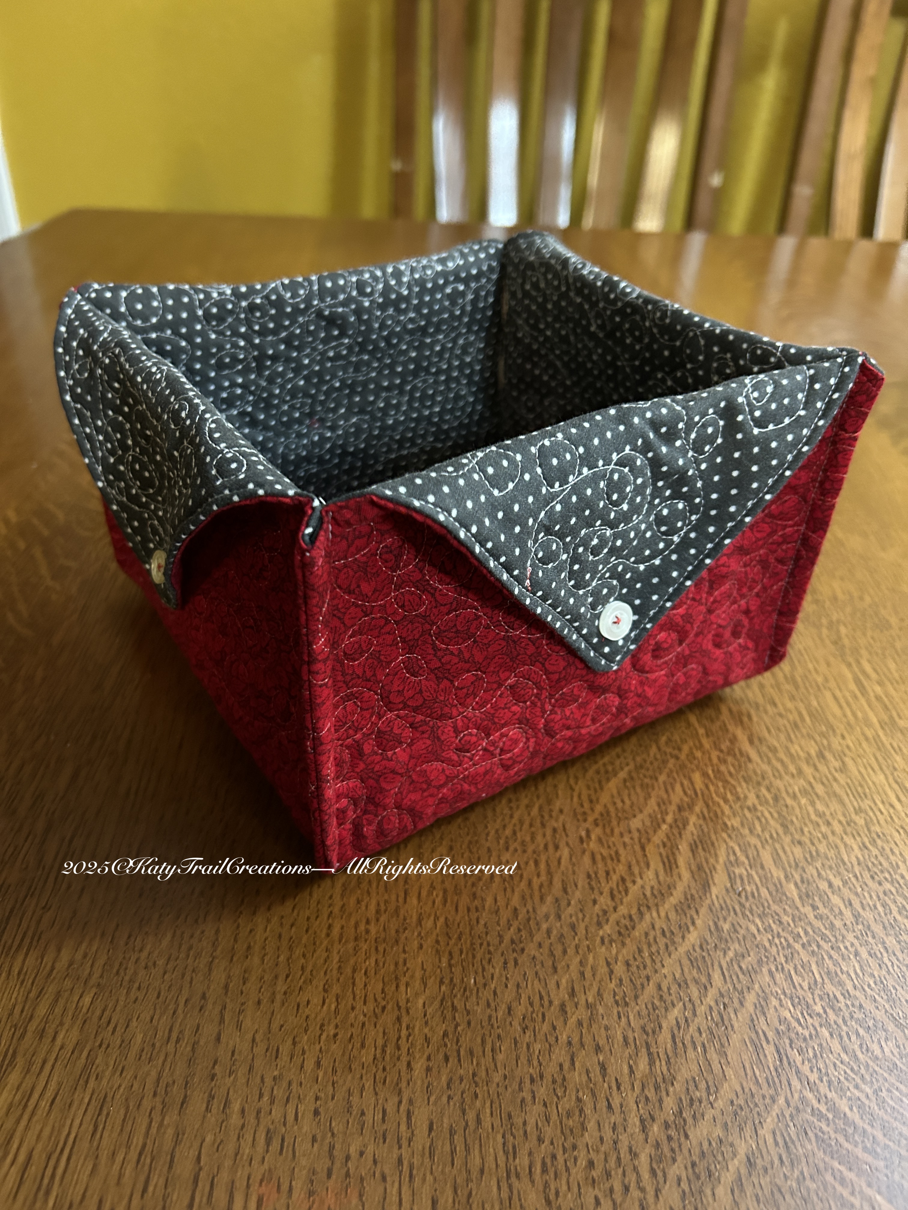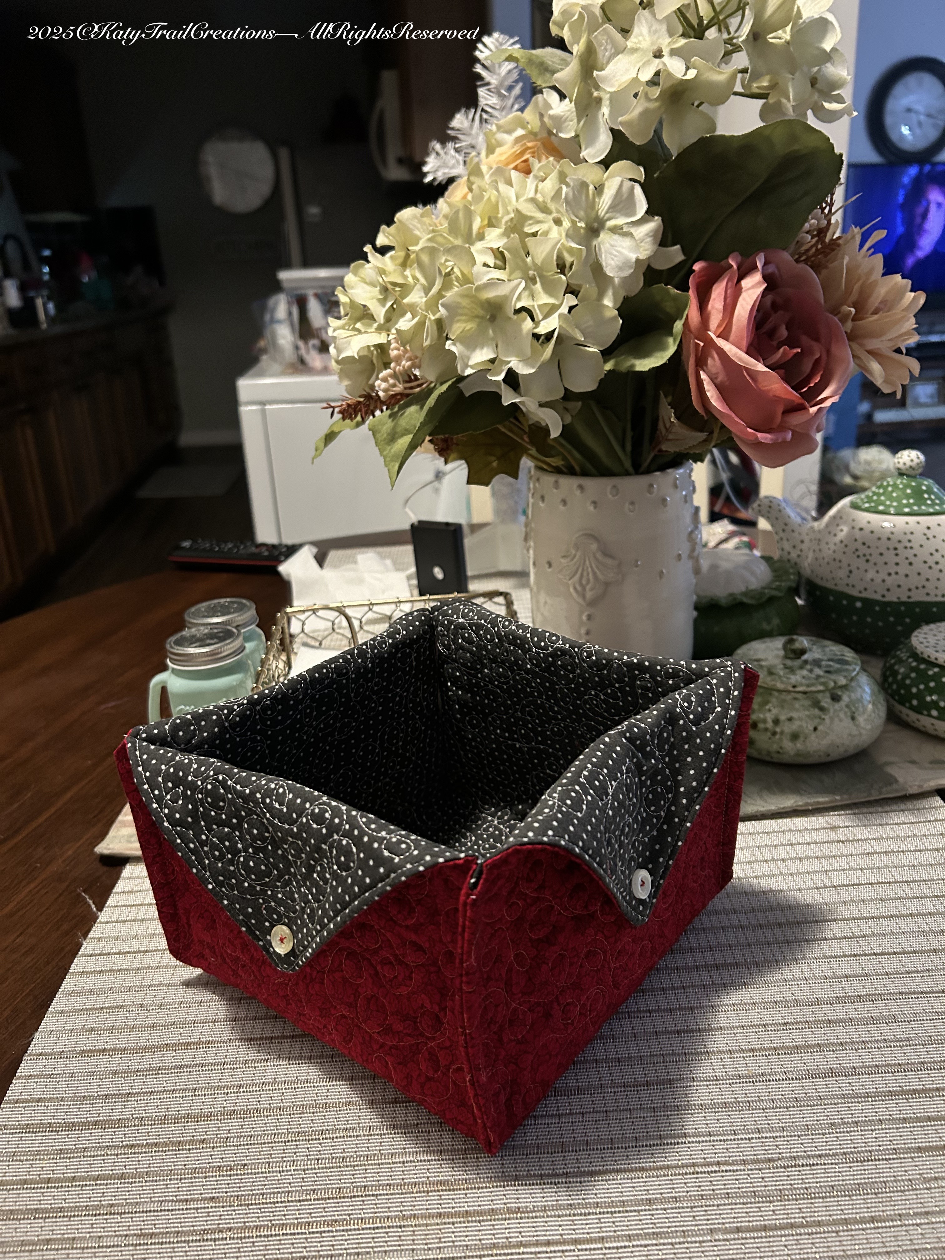 I think it turned out well enough. I liked the fact that I only had to use normal batting. I prefer to use what I have and not purchase ‘special’ notions that I’ll only use once or twice. So if you’re needing an easy basket idea, this one worked out well for me. Note: I started out with 2, 18 inch squares of fabric & used the 2 1/2 inch corners she mentions in the tuturial.