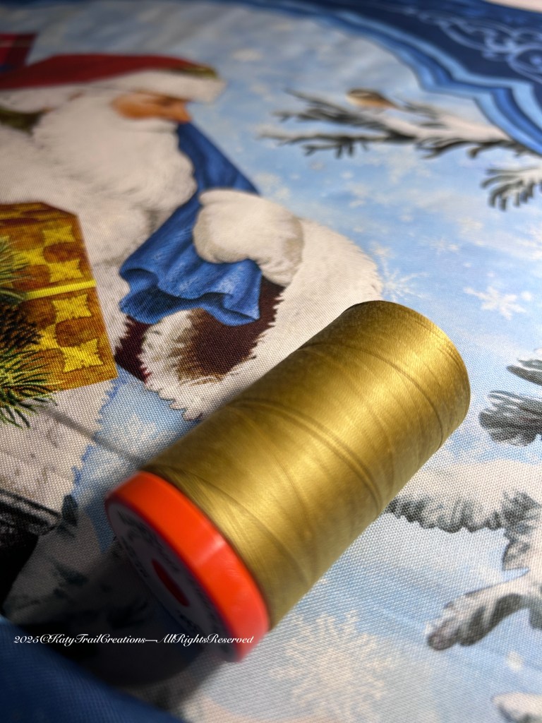 Gold aurofil thread from a thread club purchase. And the victim is Santa on a fabric panel from Missouri Star Quilt Company. They had a sale. ‘Nuf said.