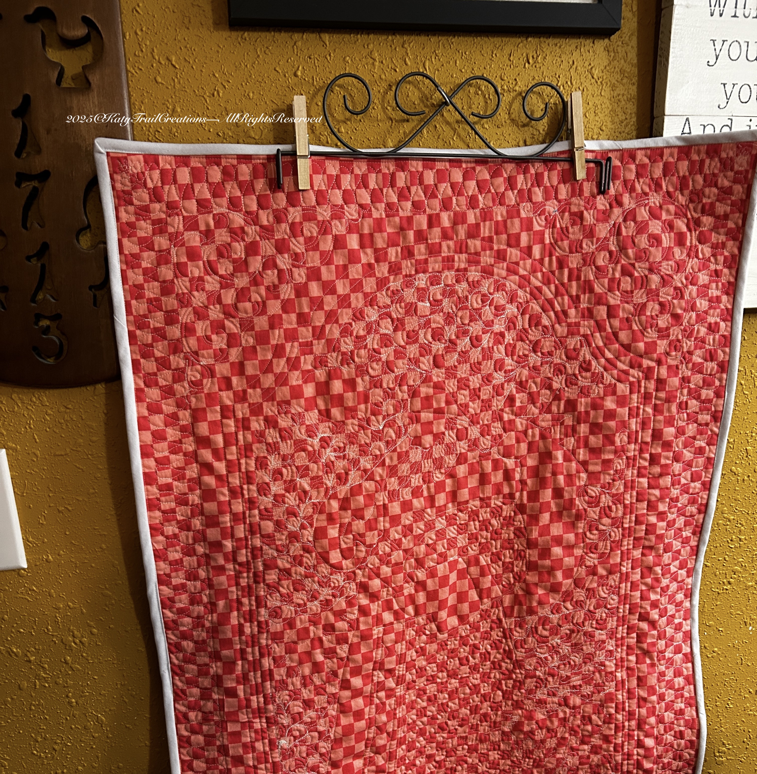 If you click each photo above, you’ll be taken to the full size photo for any details. You’ll notice I need a larger quilt hanger for my front door. So it isn’t staying there. I also need to rearrange some stuff on the wall. But since Christmas isn’t a very long time off, I think it’ll be fine as is. Other spaces to hang this would be over a couch, recliner, above the fireplace (wish I had one), or basically anyplace you can hang a picture. But this one’s not for sale. So no Etsy promo today.