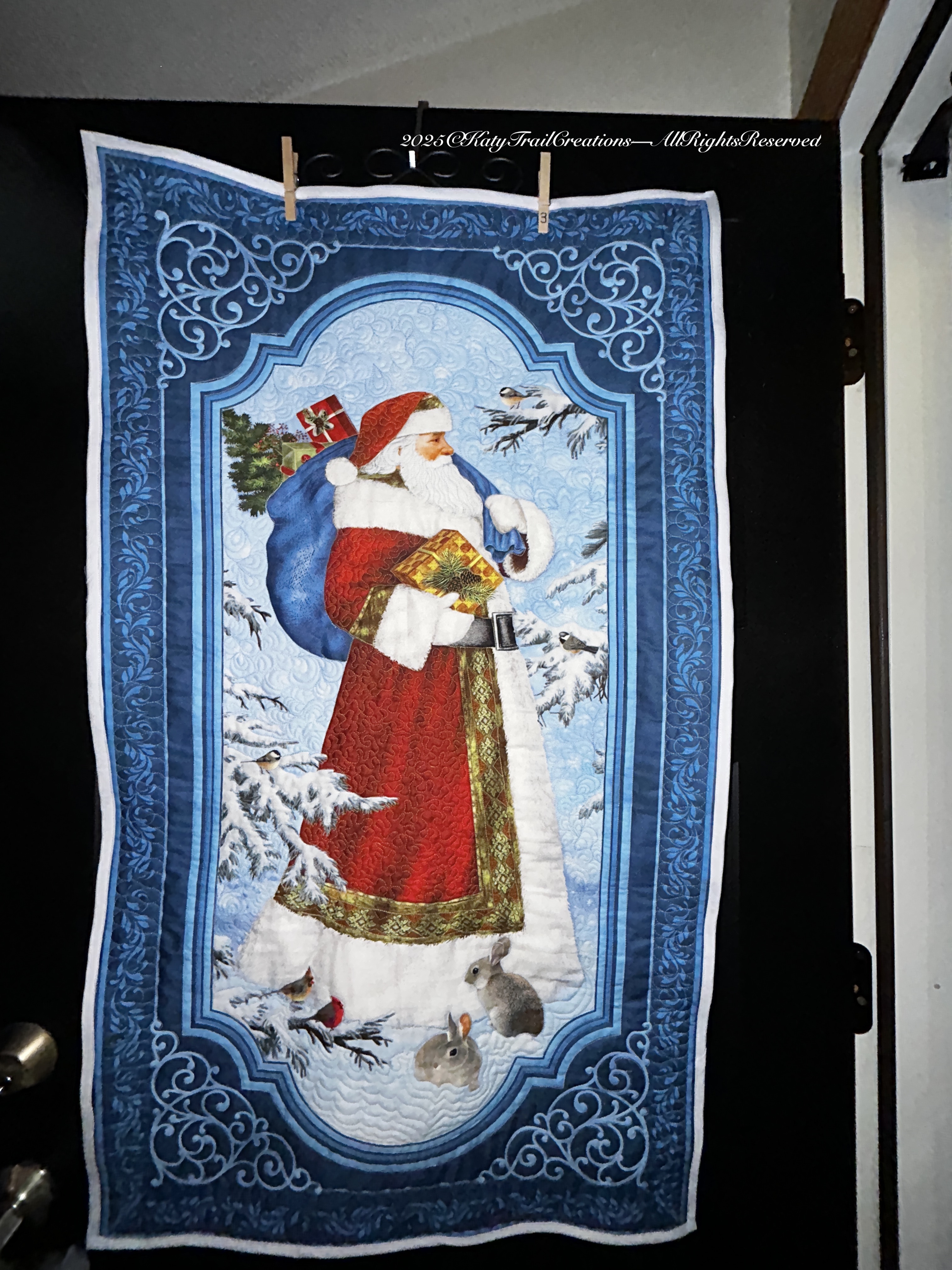 Something I’ve learned by scouring the Internet is that there is a void when it comes to “how to quilt an elaborate panel”. I found a good video by Rob Appell so want to shout out here to him on his ‘Trapunto Quilting on a Fabric Panel” that got me jumpstarted with just quilting on the details of the design. More recognized as landscape quilting, this method was what I went with. It is a 7-yr old video! So that pretty much tells you how scarce the info is on what to do with preprinted fabric panels. I apologize that I only have photos here. But I hope it helps someone.