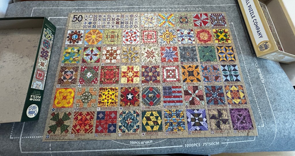 For me, there was a nice burst of interest from the puzzle above. There are the different patterns, the color combinations and the little details in the fabric designs in each block. Just some food for thought in case the usual Pinterest visits aren’t working for you.