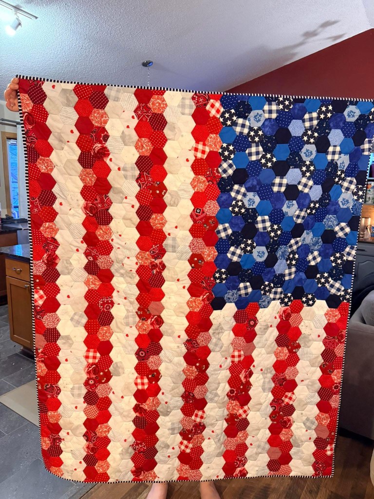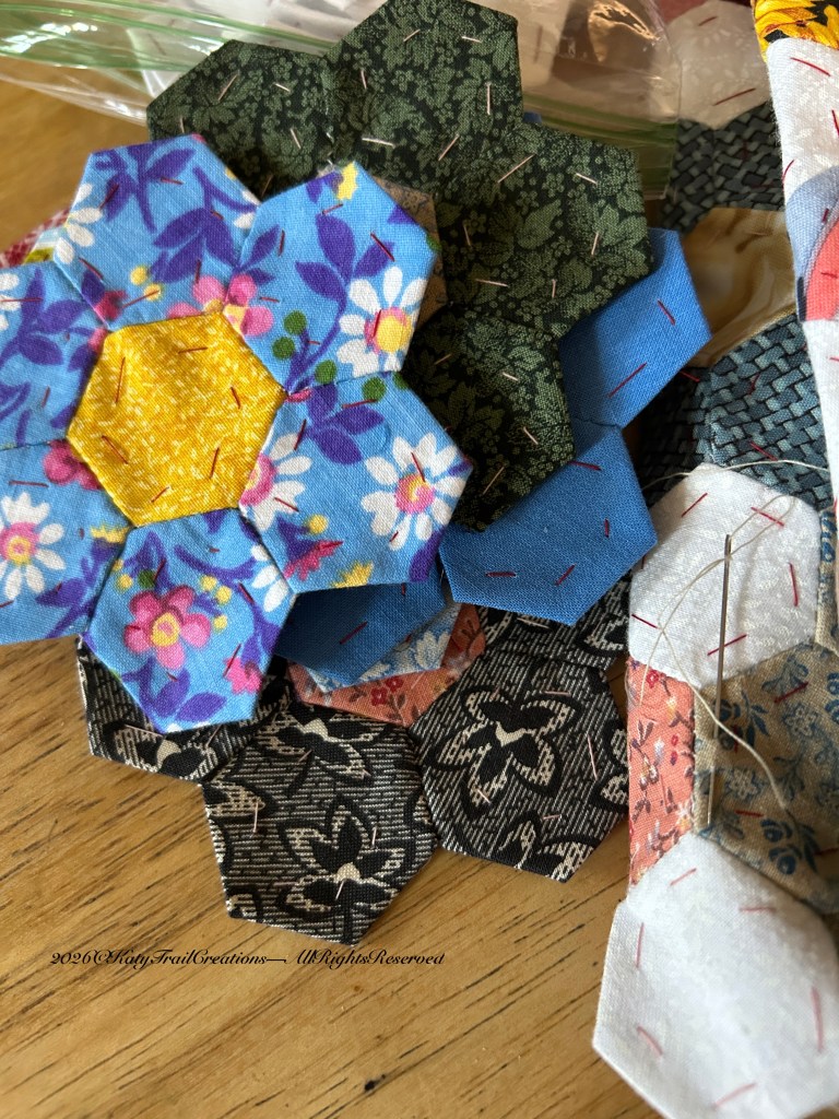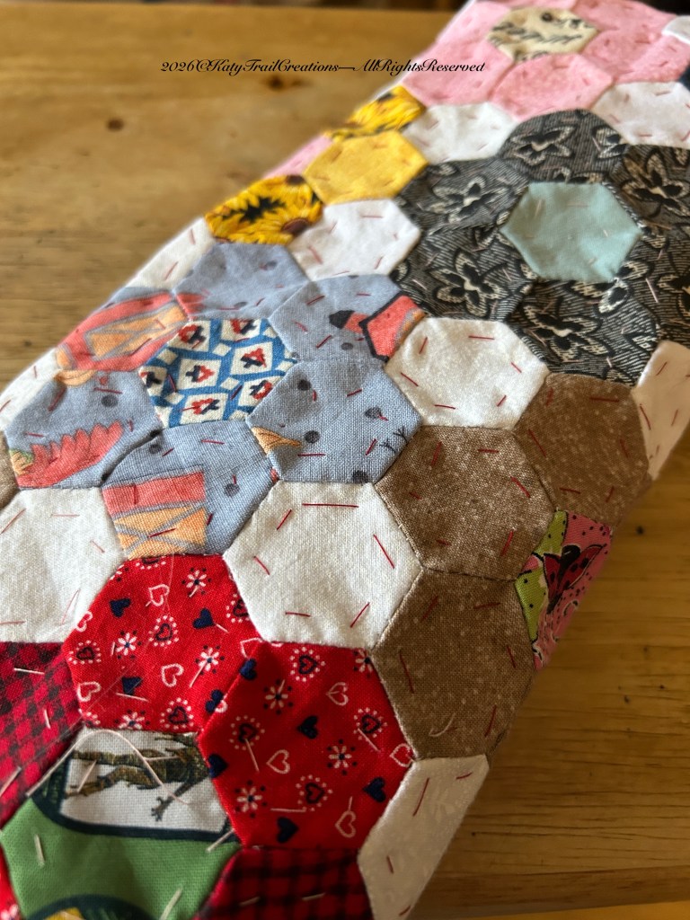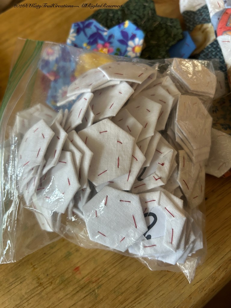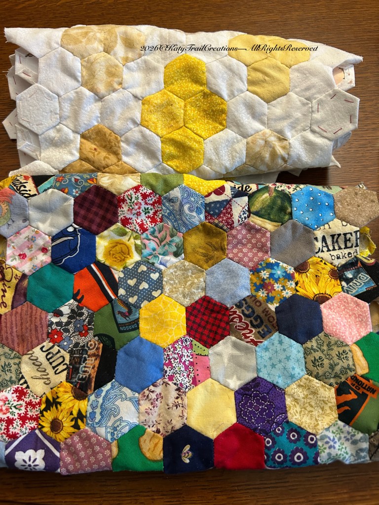 On the left, there’s a haypenny runner and below it a scrappy runner. Both need batting and backing. I’ll be auditioning borders for them as well. On the right is a work that’s been ongoing. I keep running out of white hexies. So……