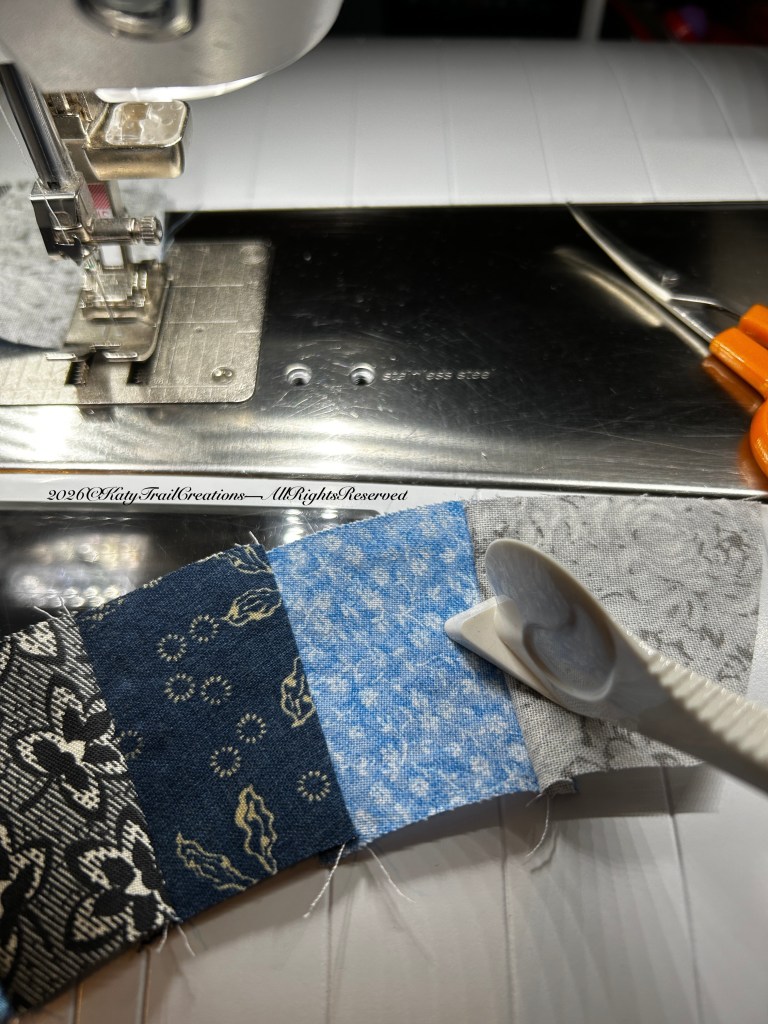 Starting on the left, The Doohickey, as fondly named by our friends at Quilter’s HQ in Olathe, Kansas, is also called the Multi-purpose Finger Presser Tool by Tooltron. It saves my fingers from having to finger press and it truly does a great job. My ironing board is a topic for another day. So Doohickey it is! Also the flowers are yet to be inserted so there they are, waiting patiently for me. And finally the Pic of the Day — The thread for my Valentines’ Day treat! Grand slam by my dear hubby!