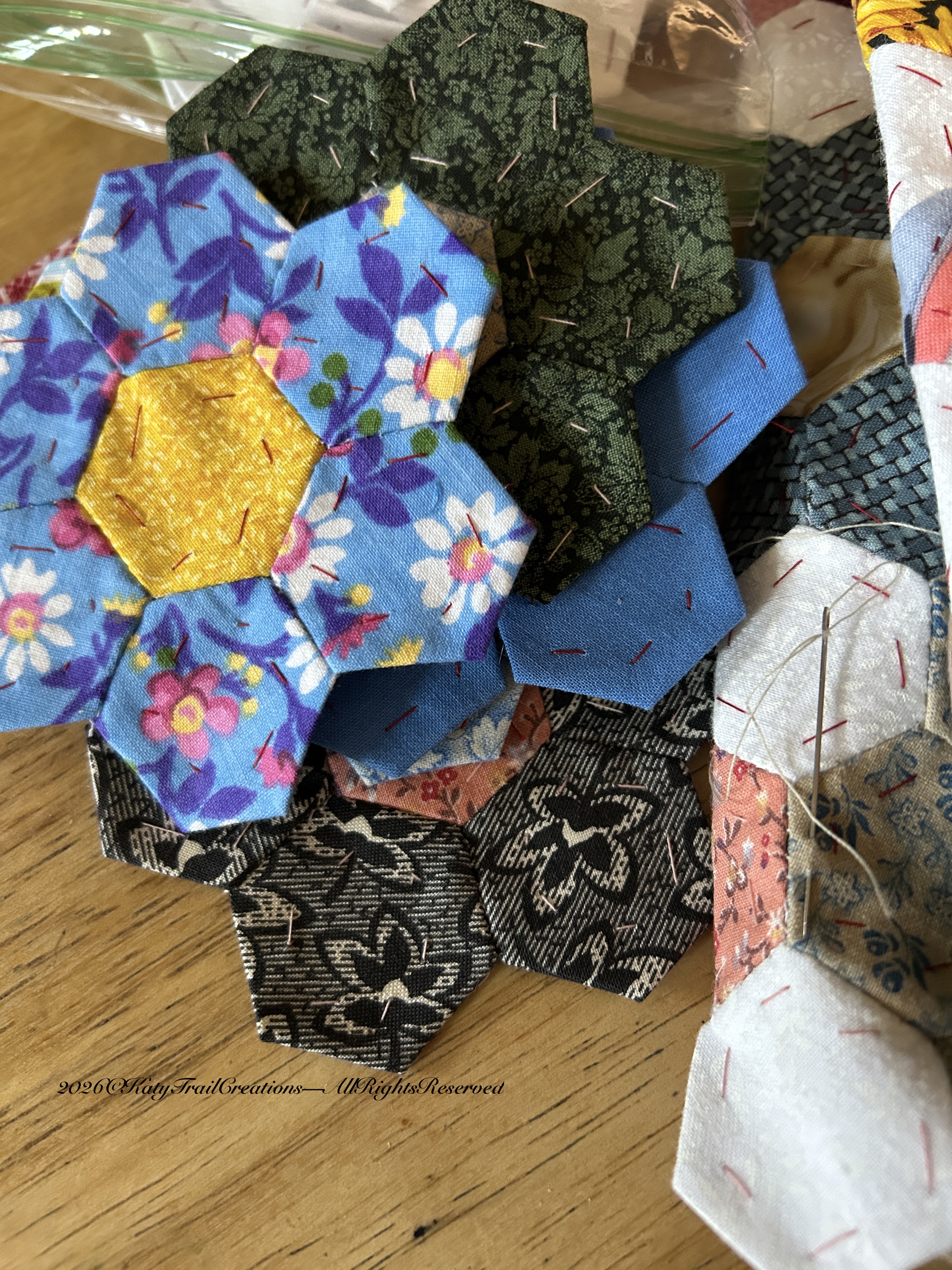 On the left, there’s a haypenny runner and below it a scrappy runner. Both need batting and backing. I’ll be auditioning borders for them as well. On the right is a work that’s been ongoing. I keep running out of white hexies. So……