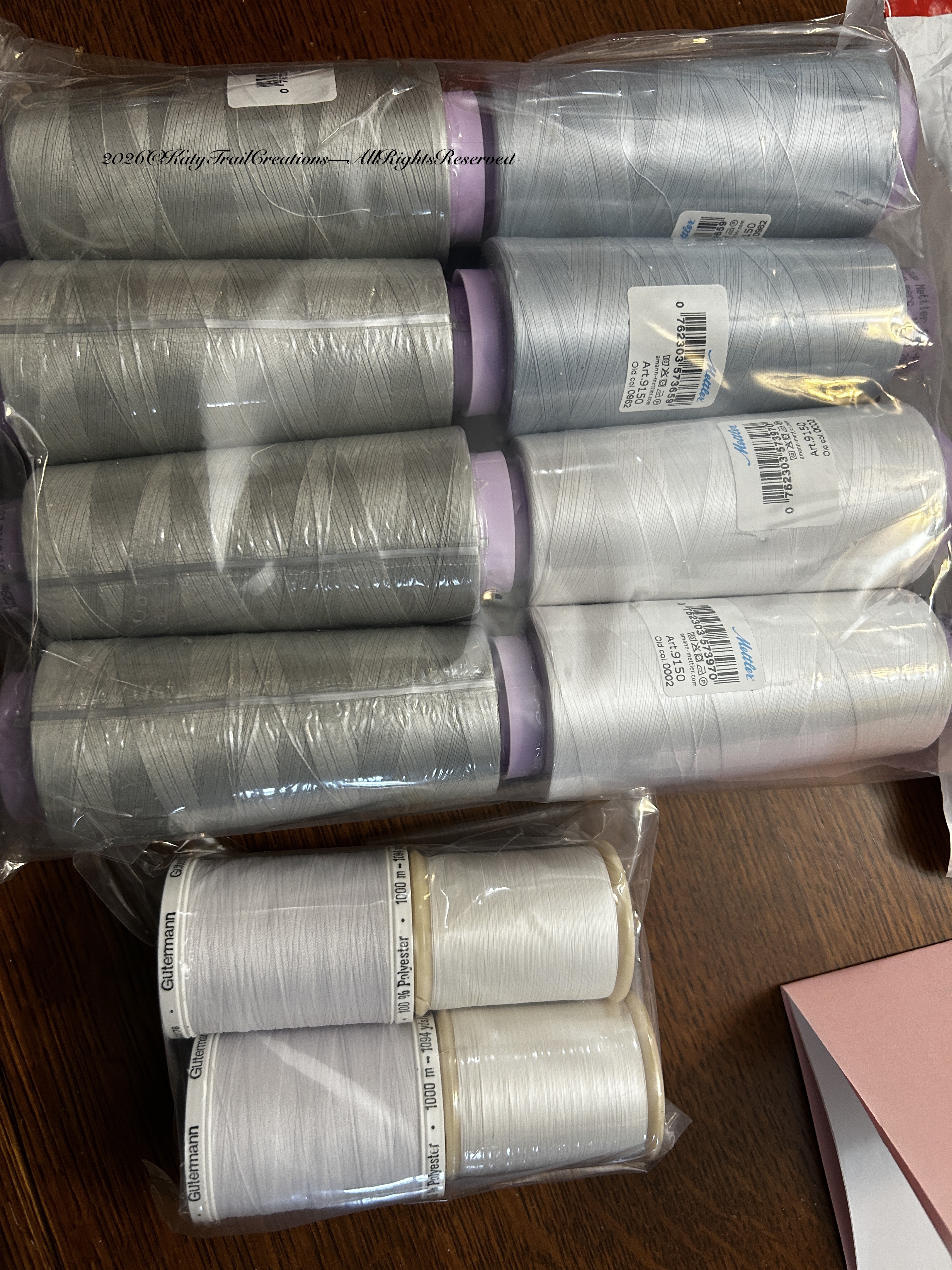 Starting on the left, The Doohickey, as fondly named by our friends at Quilter’s HQ in Olathe, Kansas, is also called the Multi-purpose Finger Presser Tool by Tooltron. It saves my fingers from having to finger press and it truly does a great job. My ironing board is a topic for another day. So Doohickey it is! Also the flowers are yet to be inserted so there they are, waiting patiently for me. And finally the Pic of the Day — The thread for my Valentines’ Day treat! Grand slam by my dear hubby!