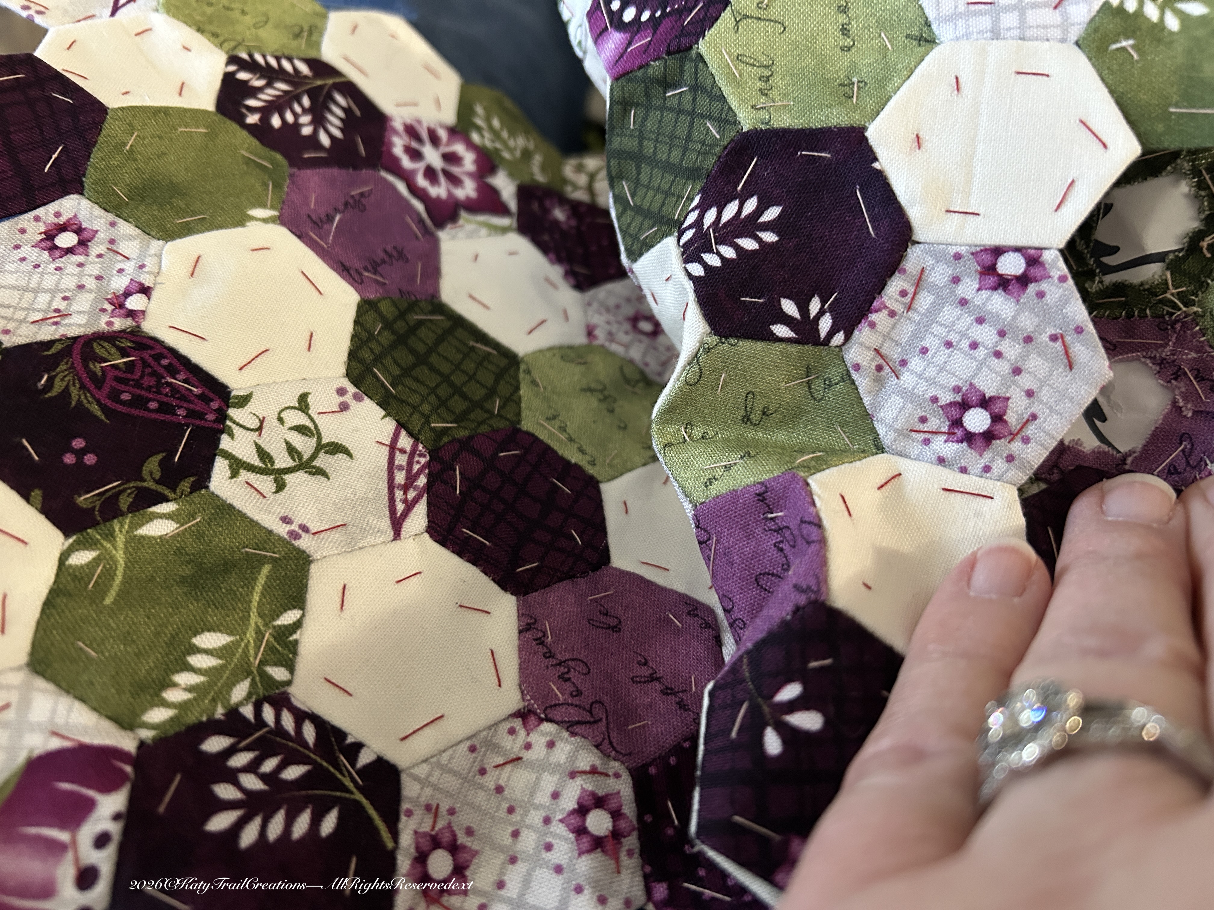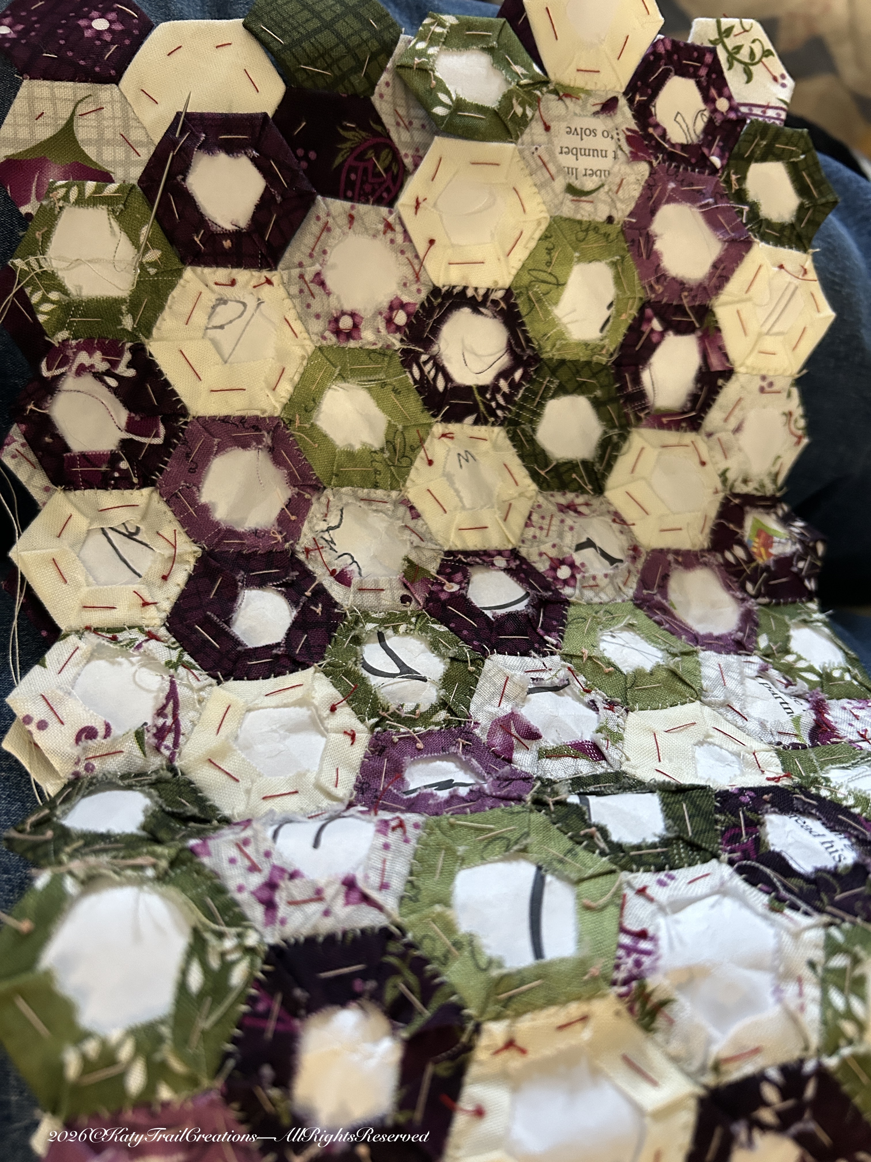 Happy to have purchased two of these fabric stacks. I adore these deep rich colors! Planning to use the other one very soon. I won’t be using said extra one for a hexi project. However, I am sold on using the coordinated colors of these precut fabrics ie:stacks, charms or whatever each brand wants to call them. Topic for another day.)