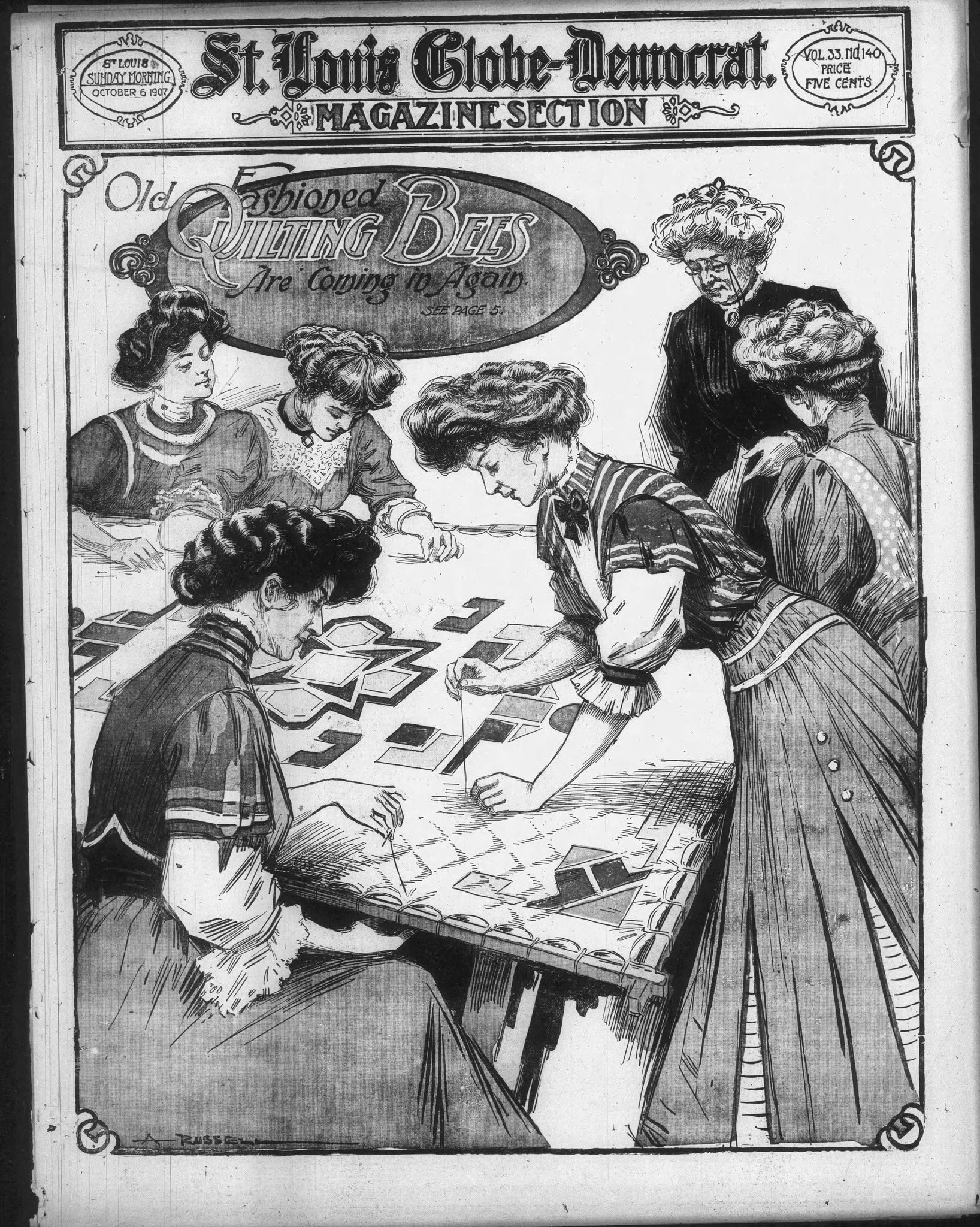 Image: Illustration depicting a quilting bee which was published October 6, 1907 in the St. Louis Globe-Democrat Magazine section. The article titled “Old Fashioned Quilting Bees Are Coming In Again” documents that quilting was having a revival or in modern terms was “trending” among the city’s society ladies. While the museum has an original color version of this newspaper in the collection, this copy is courtesy of newspapers.com.