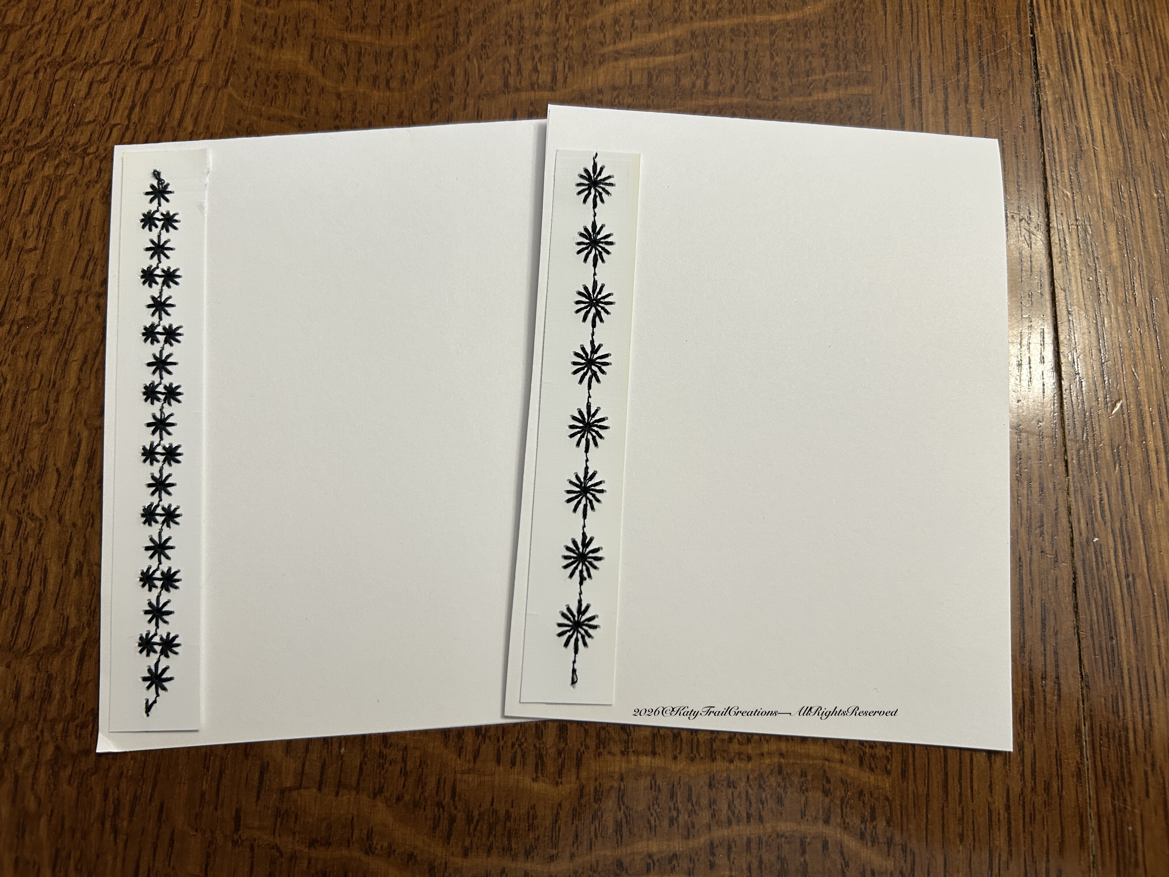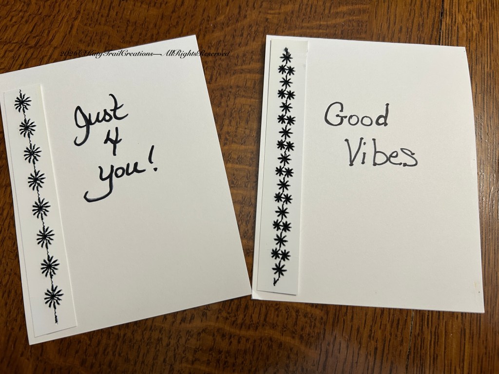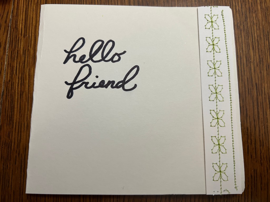 A few weeks back I mentioned sharing some handmade cards I create for my penpals & special occasions. Consider this more of a tutorial than something you’ll find in my Etsy shop. I just don’t have any desire to add these to my shop. Several reasons, but an important one is finding matching envelopes. I’d rather just insert these in an envelope from my stash and call it good. So anyway, if you have a sewing machine with some decorative stitches, I hope you’ll consider having a few of these options put away for those times you need a card in a hurry.