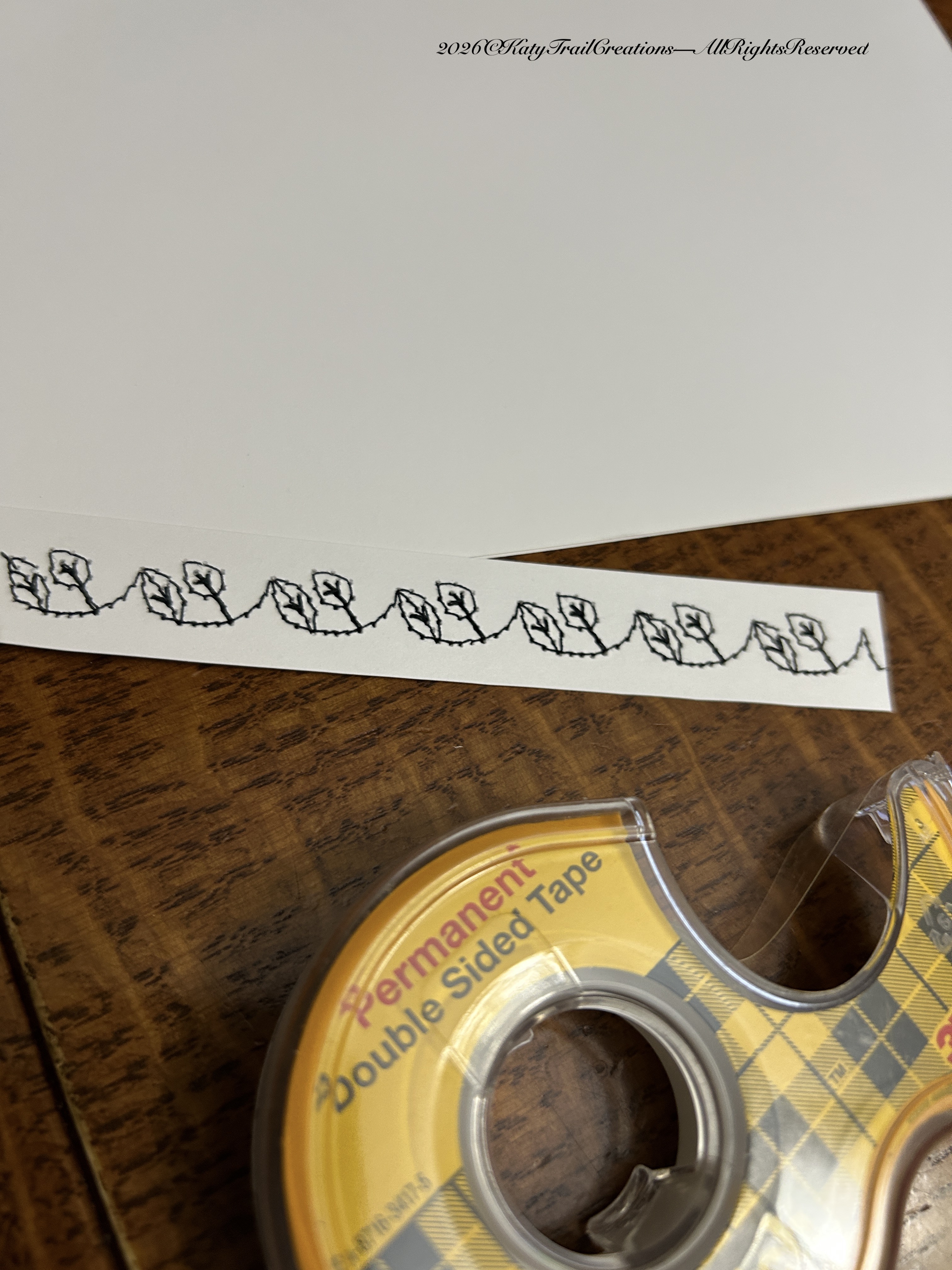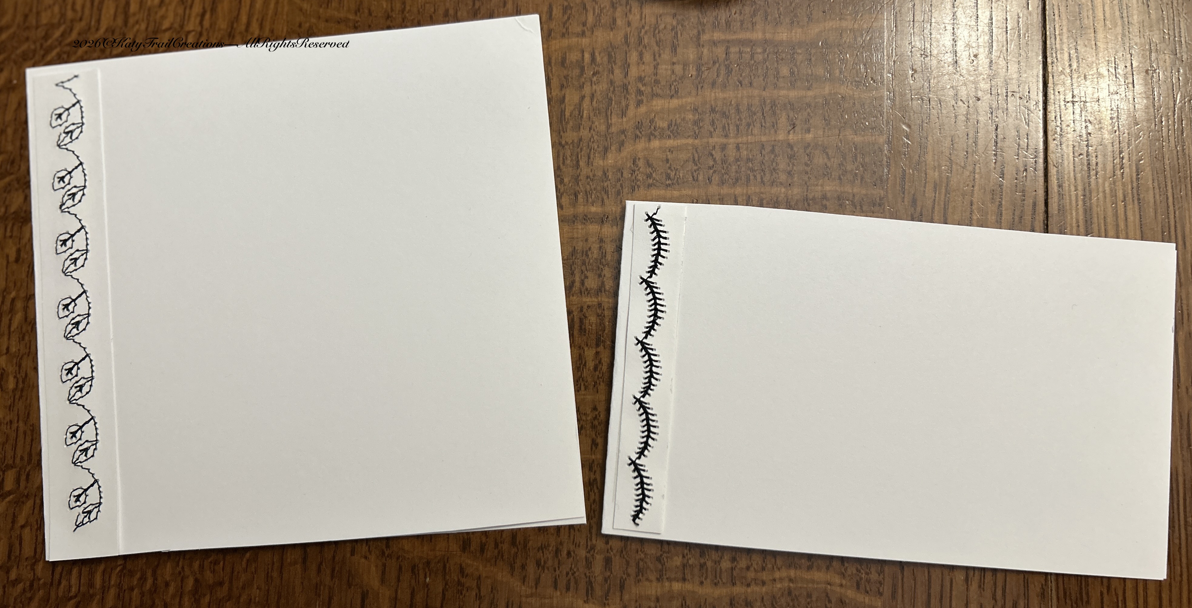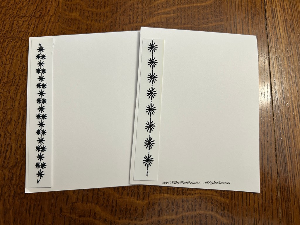As you can tell, my handwriting is not professional level. But it’s the thought that counts right? Also imperfections are signs of no Ai involvement. haha I know, that goes without saying. I also want to mention that attaching the strips with another machine stitch or glue is allowed. I just grab what’s handy most of the time. And those spools of thread that aren’t long enough for a sewing project? There’s enough for a strip of stitching. In addition, just save those older sewing machine needles for use on paper. It won’t matter if they’re dull. They pierce paper and cardstock just fine. The strips you see above were once the edges of business card printouts. I am kinda frugal.