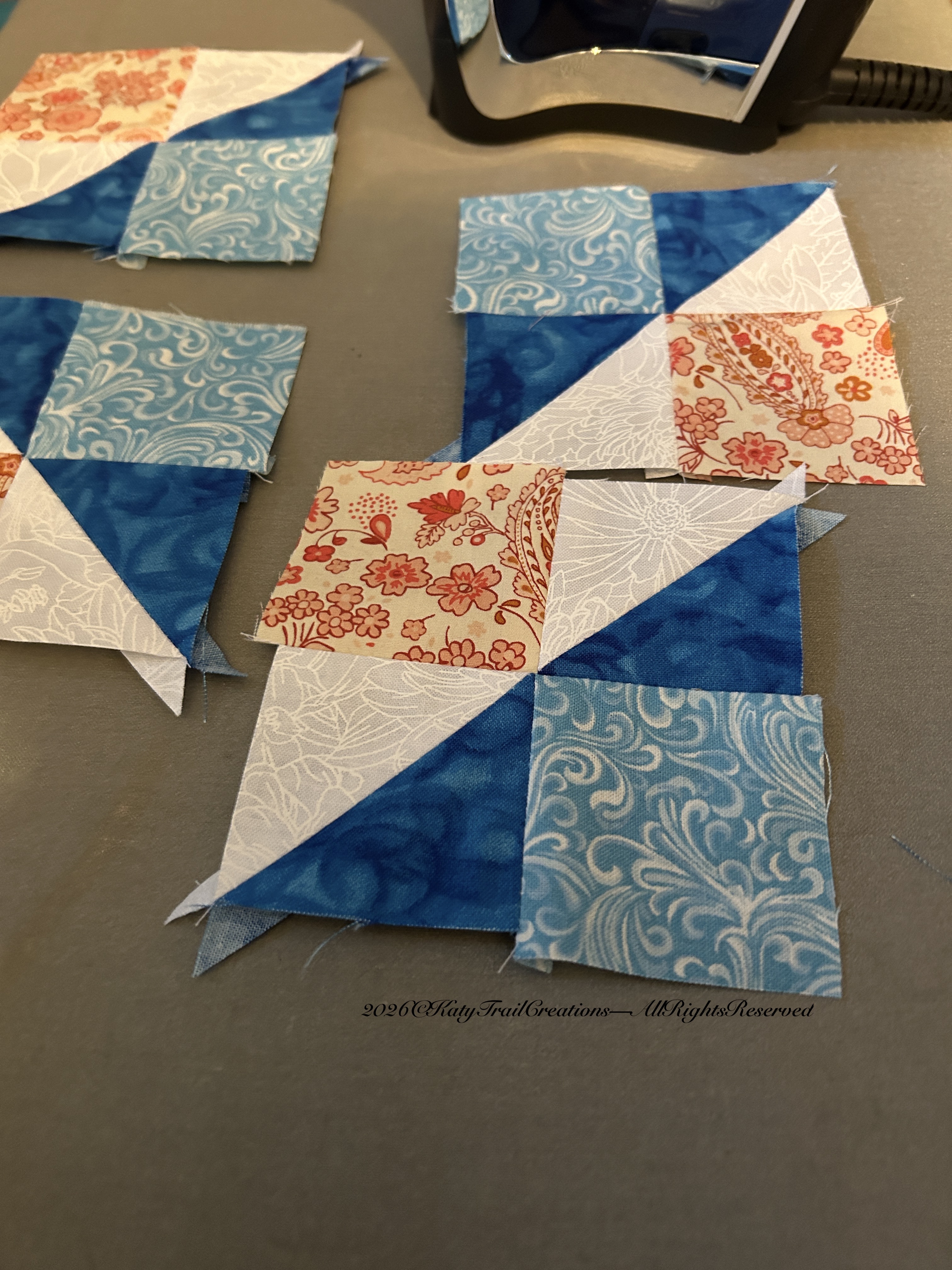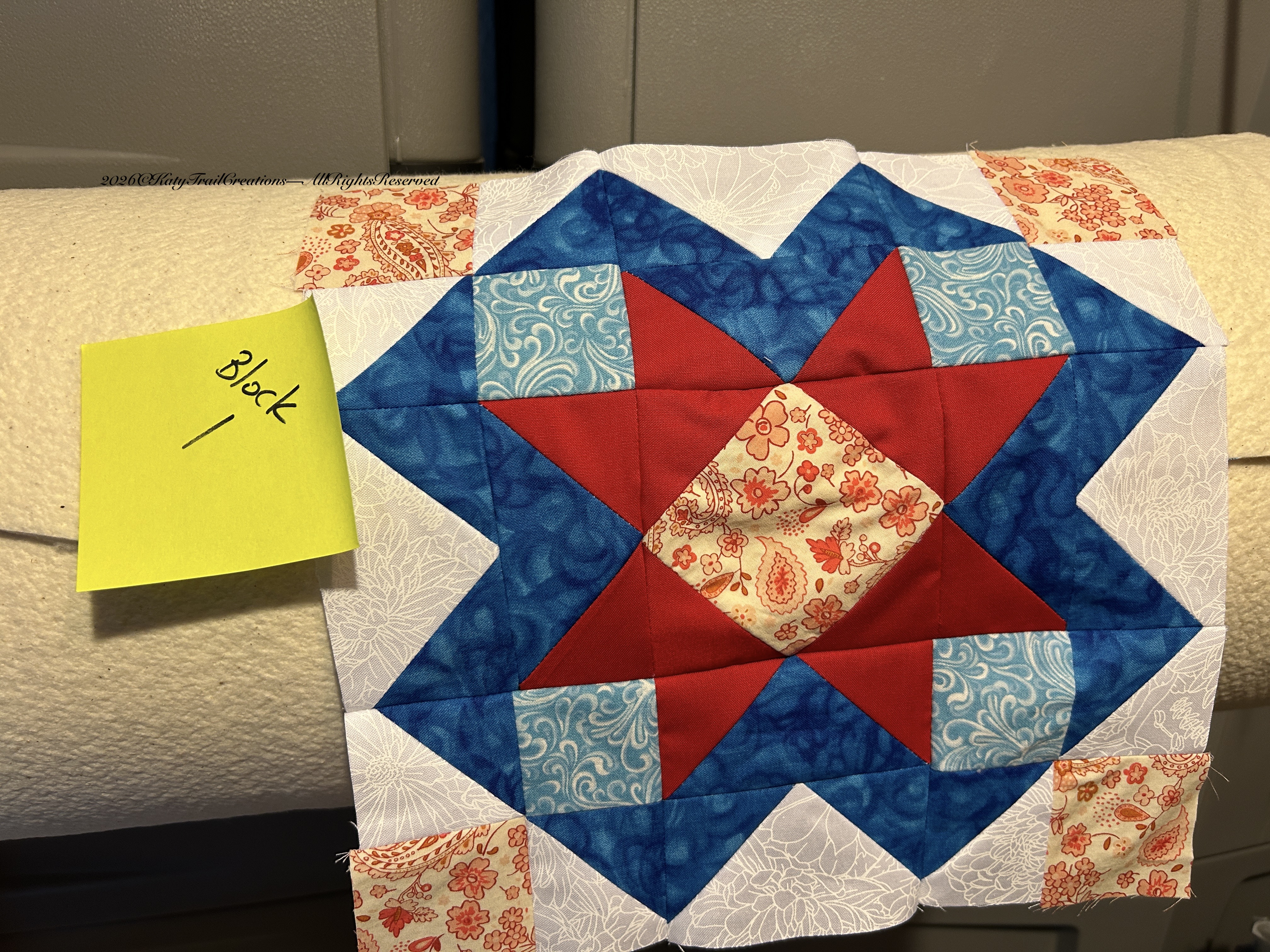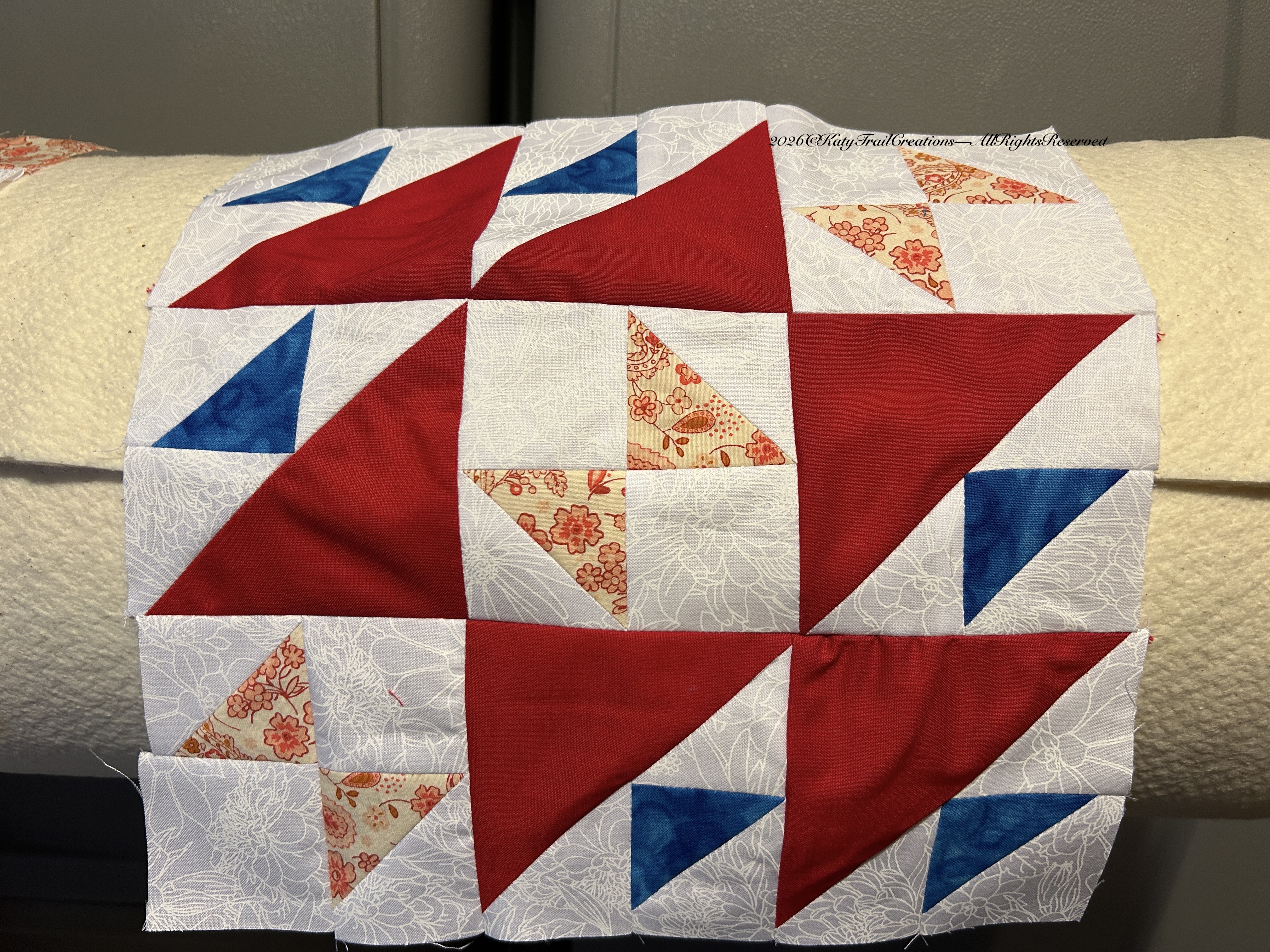 But I am happy to say I’m caught up for this week on the Quilt-a-long I’m participating in. This quilt pattern is the American Heritage Sampler by Joan Sews. I’ll be tuning in tonight at 6PM Central time to Joan Sews on YouTube to see if she has any good pointers. Never hurts to learn something new, right? Following are some pics of block 1 & 2.